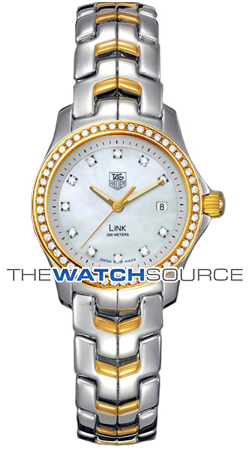 Polished 18KT Yellow gold and Stainless steel case and bracelet, White Mother of Pearl dial set with 11 diamond hour markers, Diamond set bezel (0.47 carats, F-G Color, Full Cut 32/24), Displays date at 3.