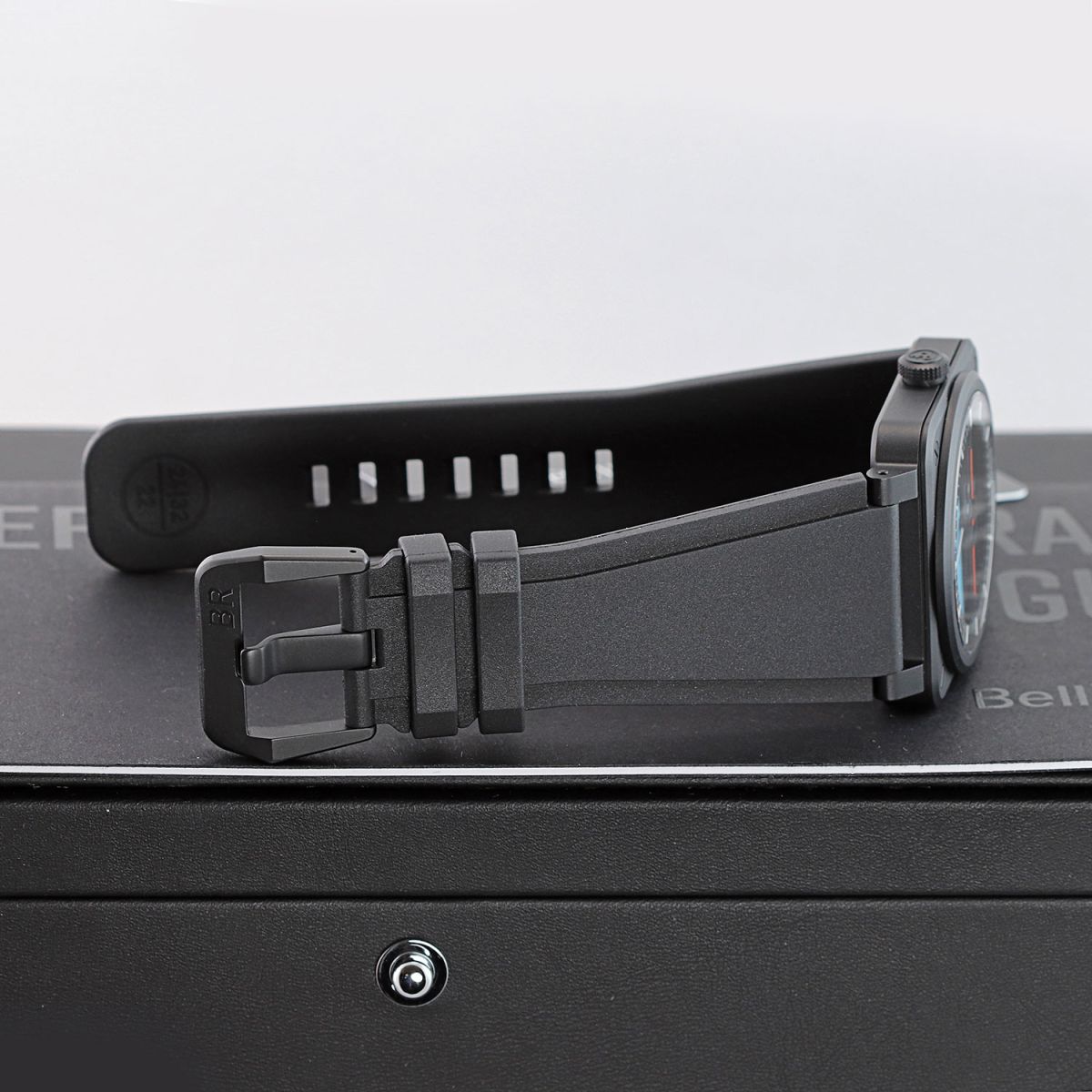 - Fitted on its original Bell & Ross black rubber strap with a black PVD coated stainless steel tang buckle. This strap is unworn in new condition with its full wear lifespan remaining.