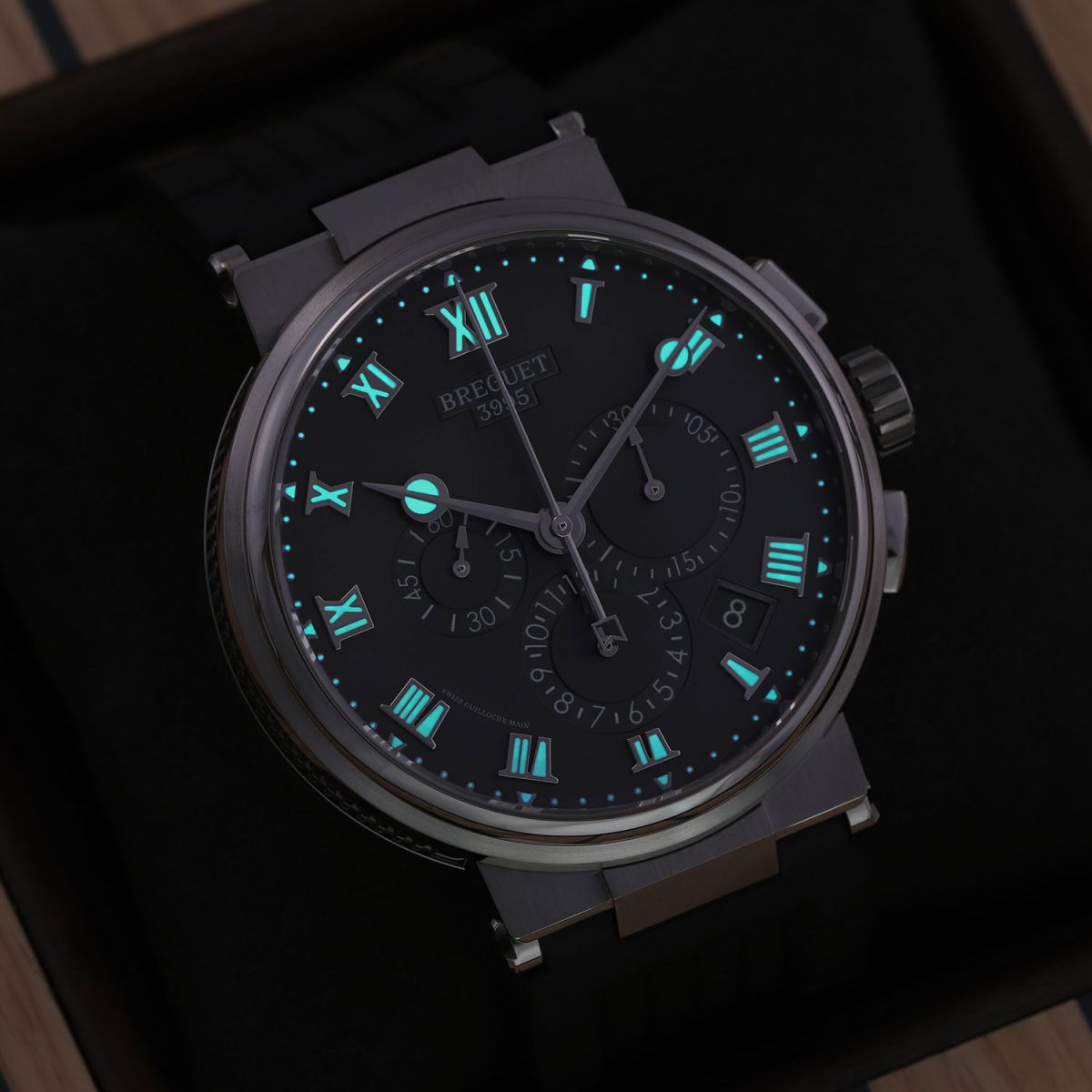 Case: Brushed & polished titanium case with Breguet's signature fluted/coined-edge case band. Grey dial with a fine sunray finish. Polished hands, the hour & minute hands with luminous filled tips. Applied polished Roman numeral hour markers with luminous fill. Luminous dot minute/seconds track. Date window between 4 & 5 o'clock. Small seconds sub-dial at 9 o'clock.