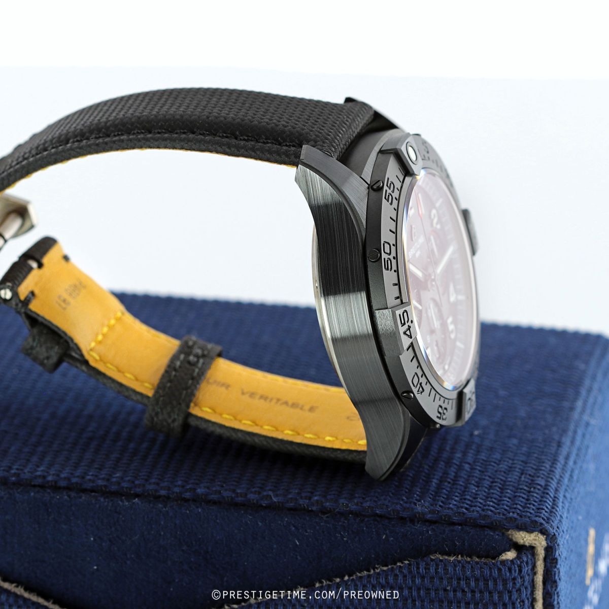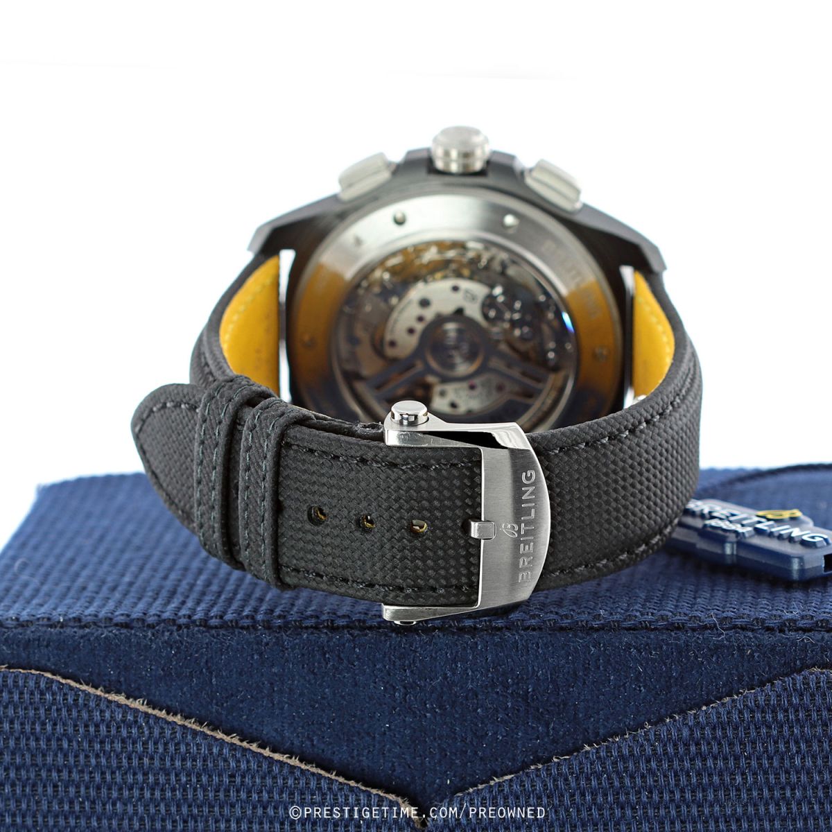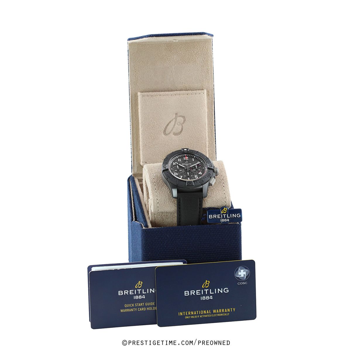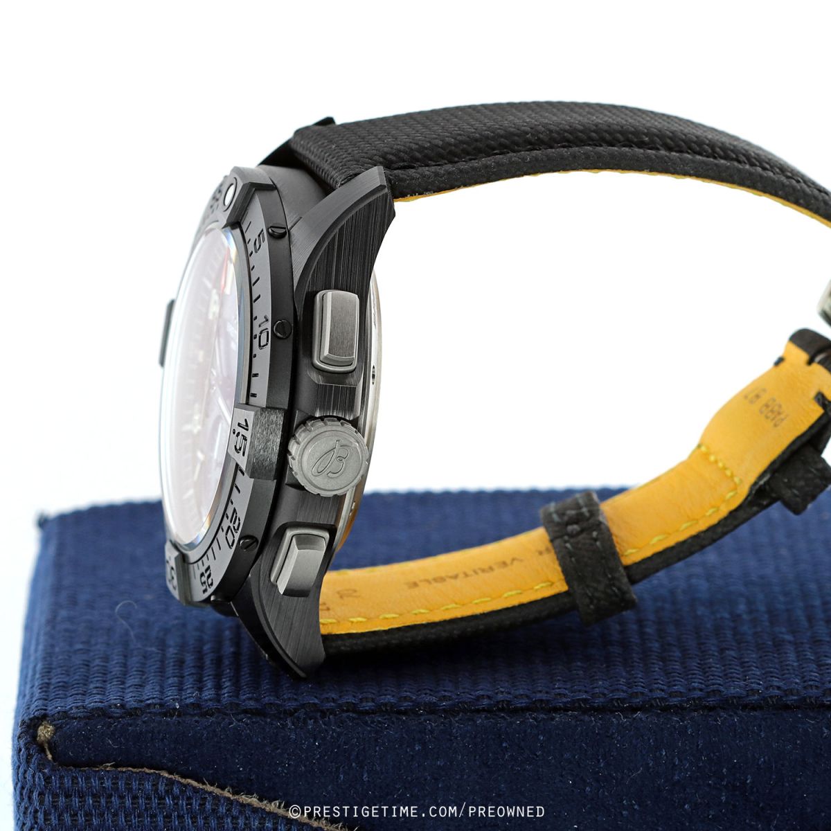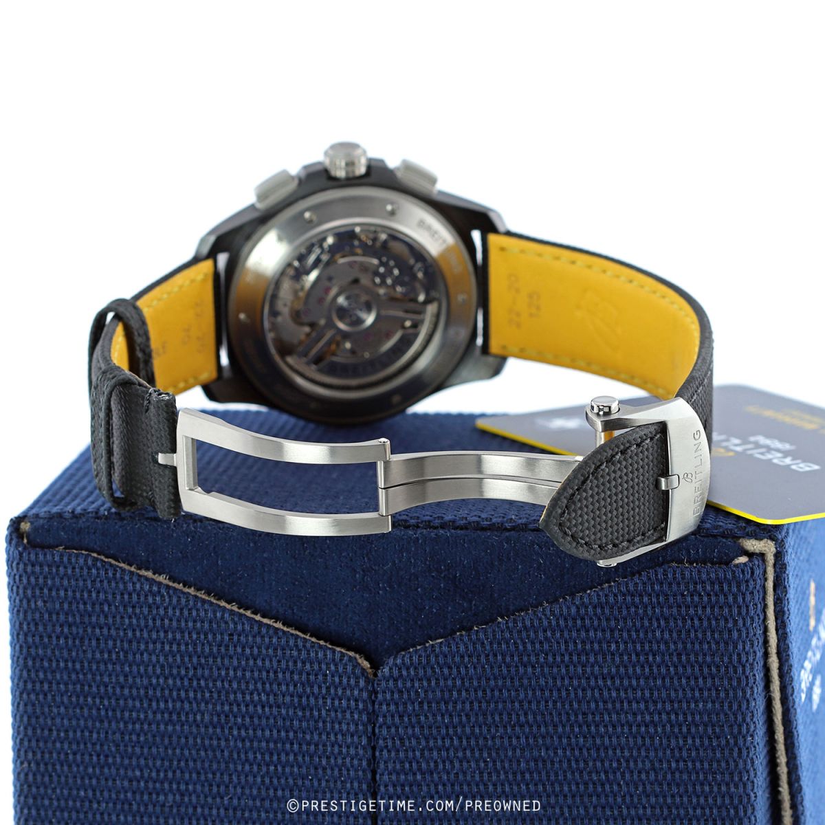 Strap: Fitted on its original Breitling black calfskin leather strap with a titanium push-button deployant buckle. The strap was worn a handful of times only, it is in excellent condition with its full wear lifespan remaining. We would be comfortable rating the strap as in 99% overall condition.
