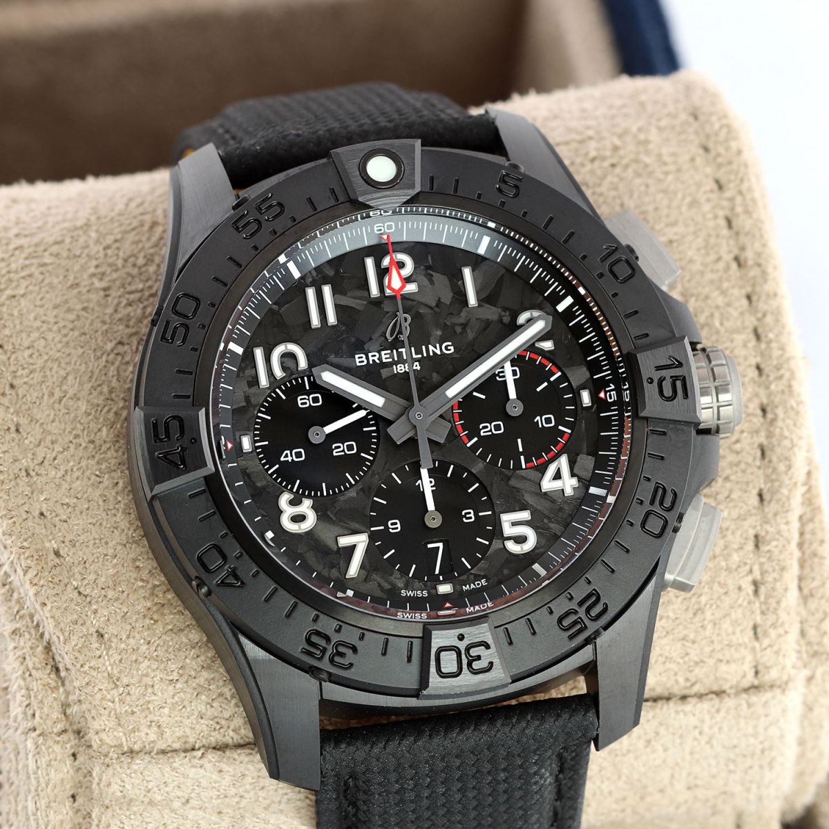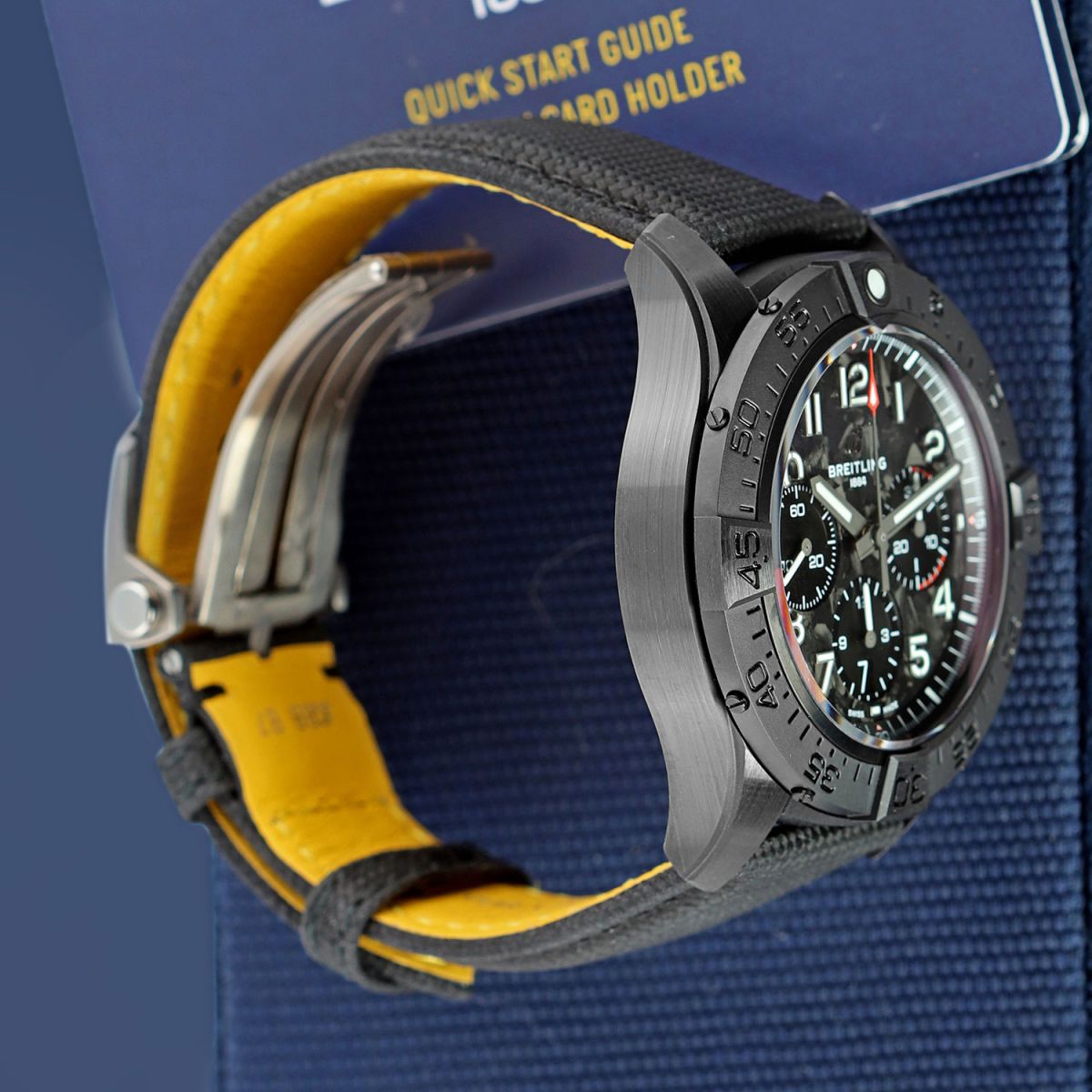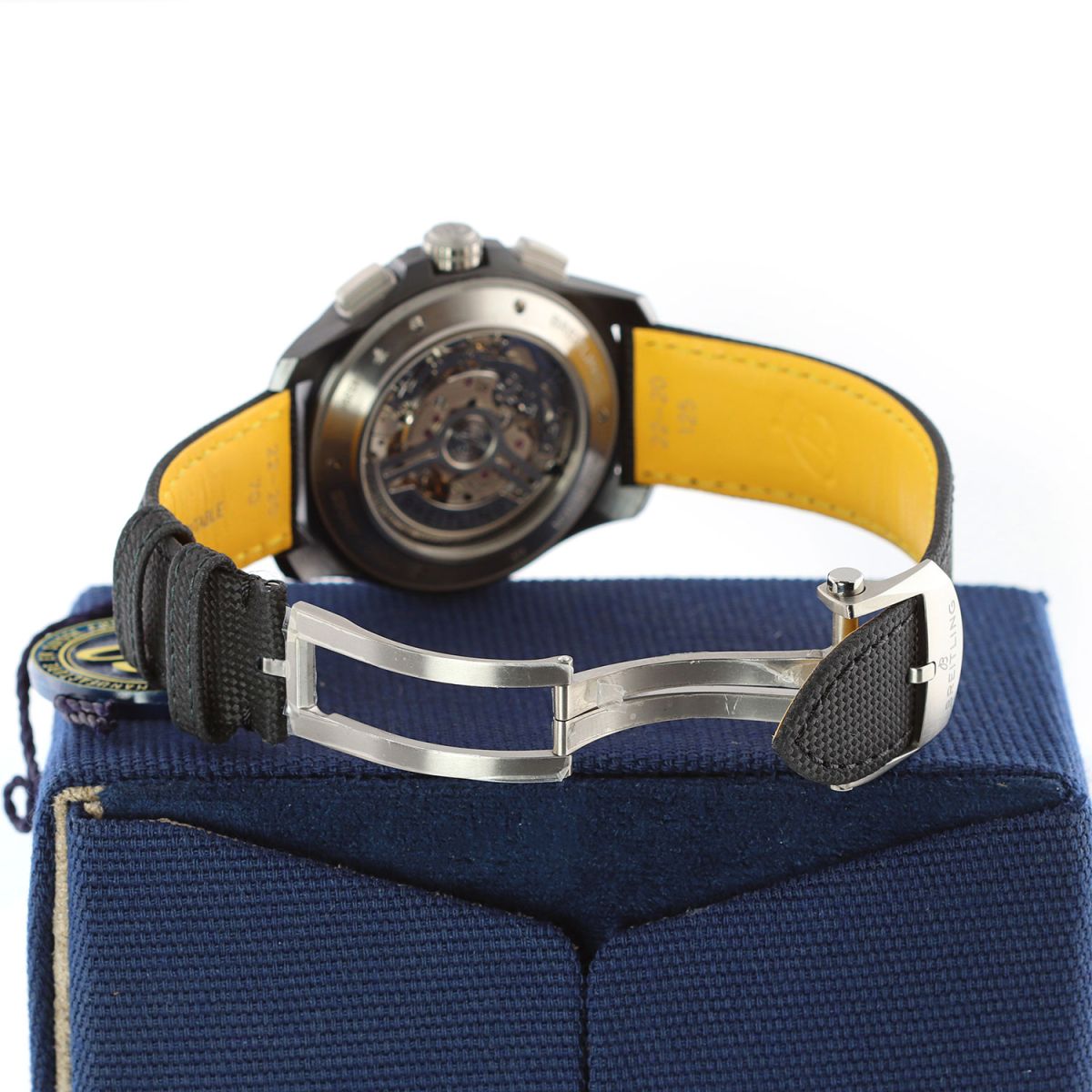 Strap: Fitted on its original Breitling black calfskin leather strap with a titanium push-button deployant buckle. The strap was worn a handful of times only, it is in excellent condition with its full wear lifespan remaining. We would be comfortable rating the strap as in 99% overall condition.