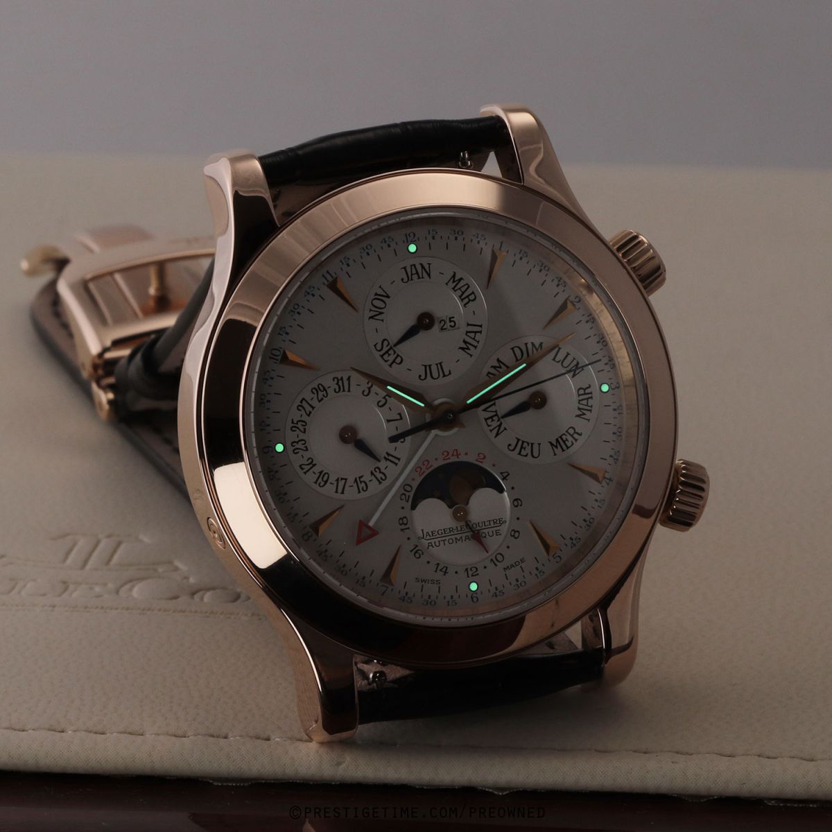 Movement: Powered by an in-house Jaeger LeCoultre caliber 909, beats at 28,800 vph (4Hz), contains 36 jewels & has a power reserve of +/- 45 hours. The Rotor features a peripheral oscillating weight in 22kt gold.