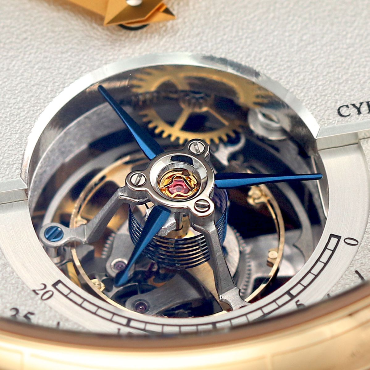 - 60 second flying tourbillon at 6 o'clock with a tri-blade blued steel hands acting as running seconds.