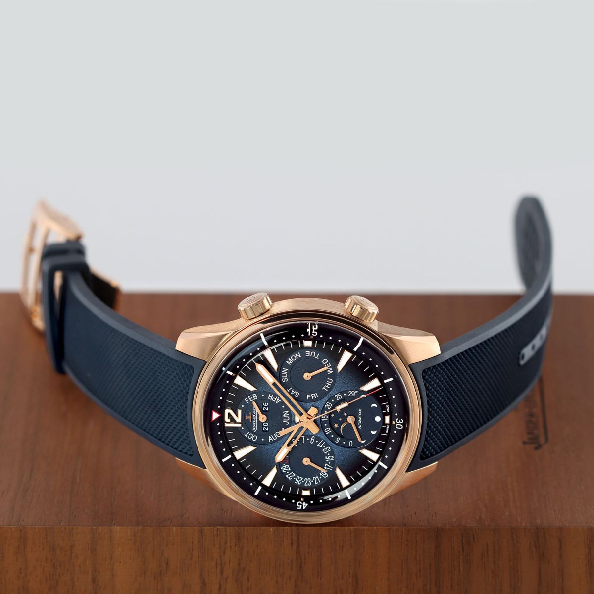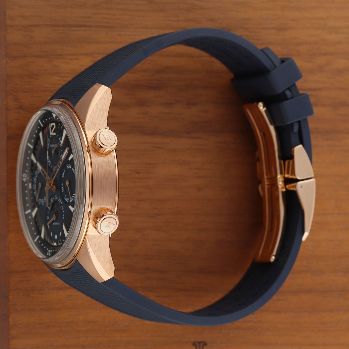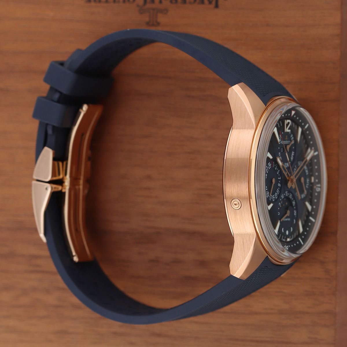 - Fitted on its JLC original blue rubber strap with a solid 18kt rose gold deployant buckle. This strap is excellent near-new condition with its full wear lifespan remaining. We would rate this strap in 99% overall condition.