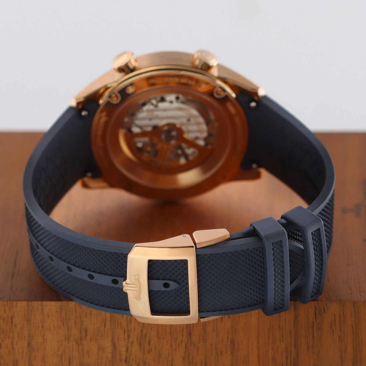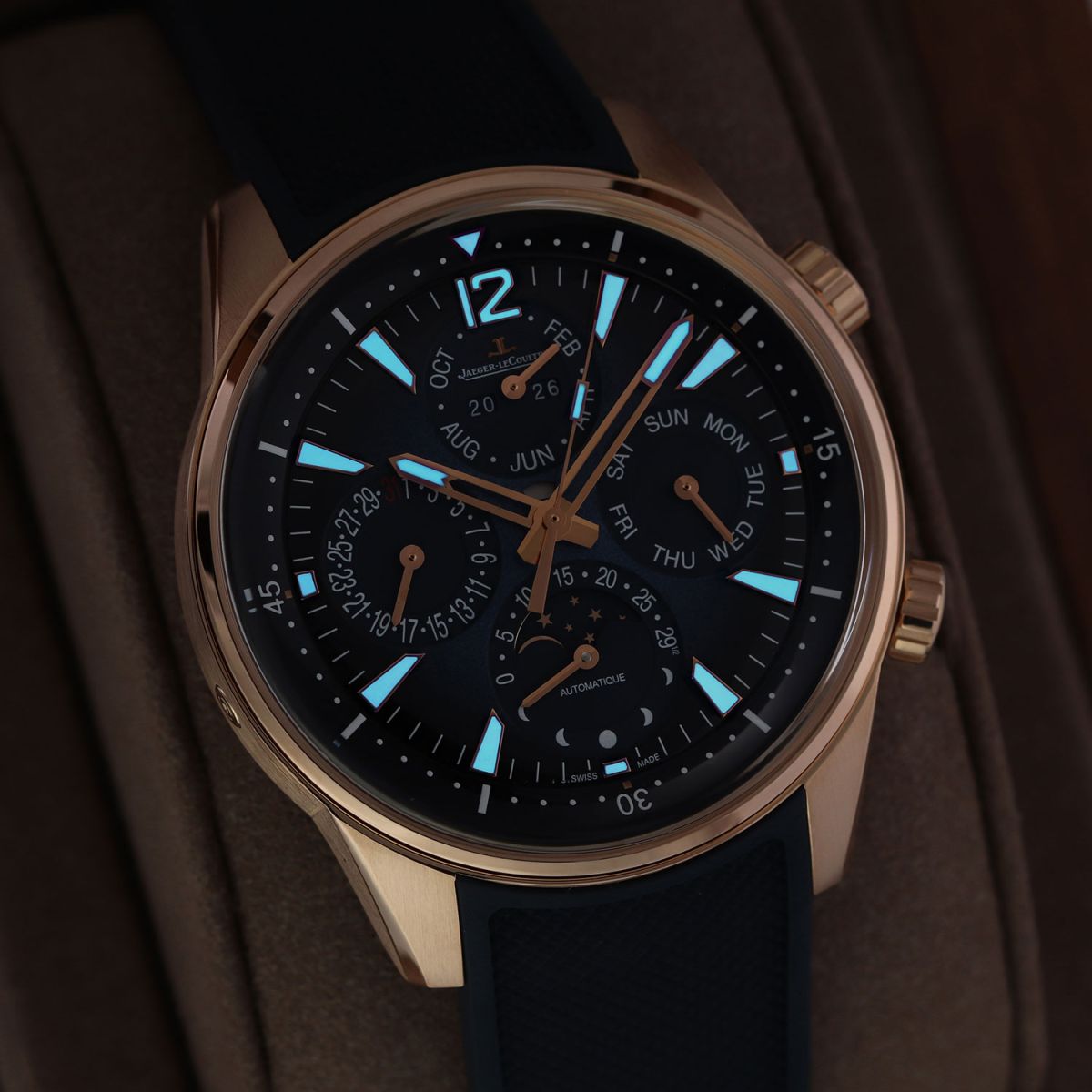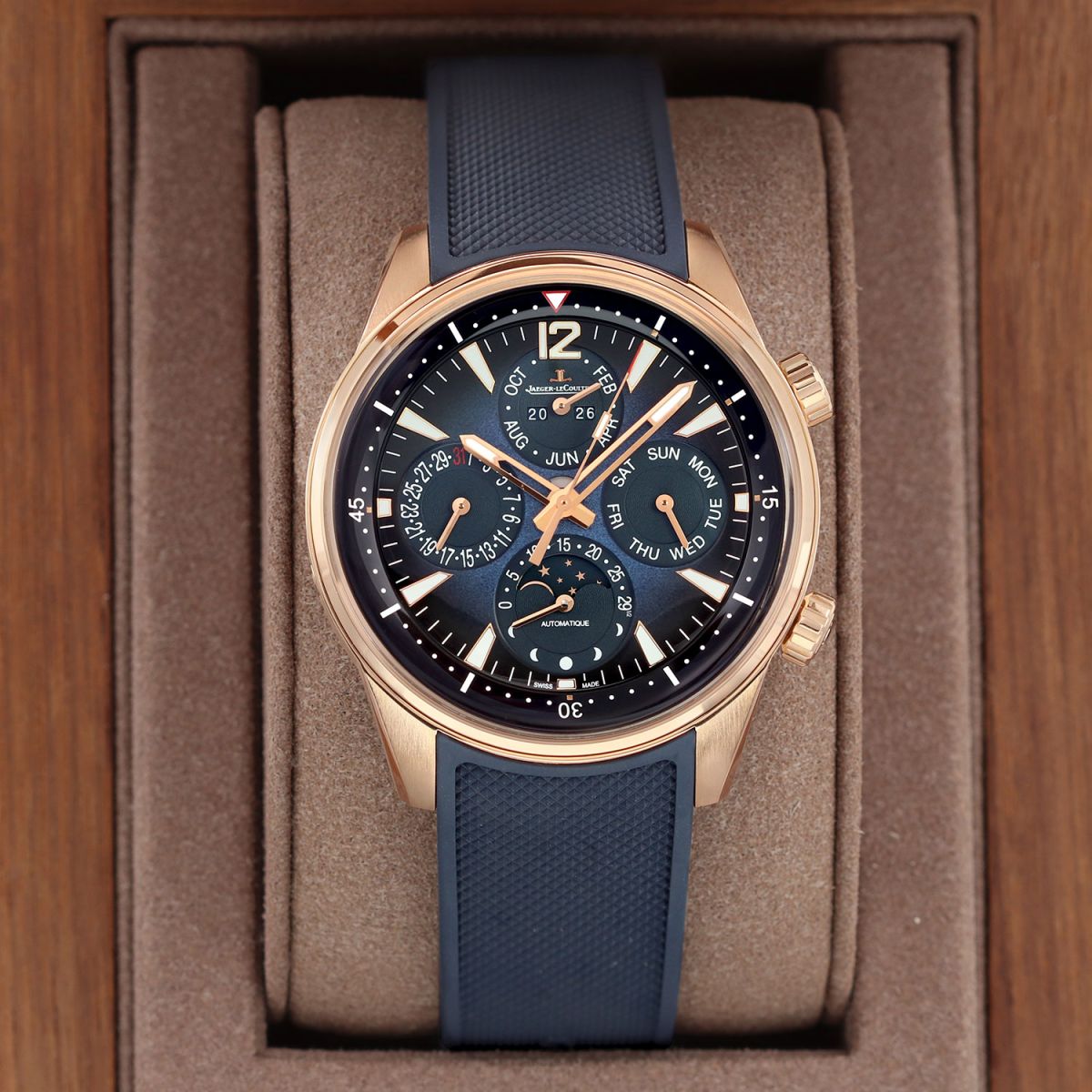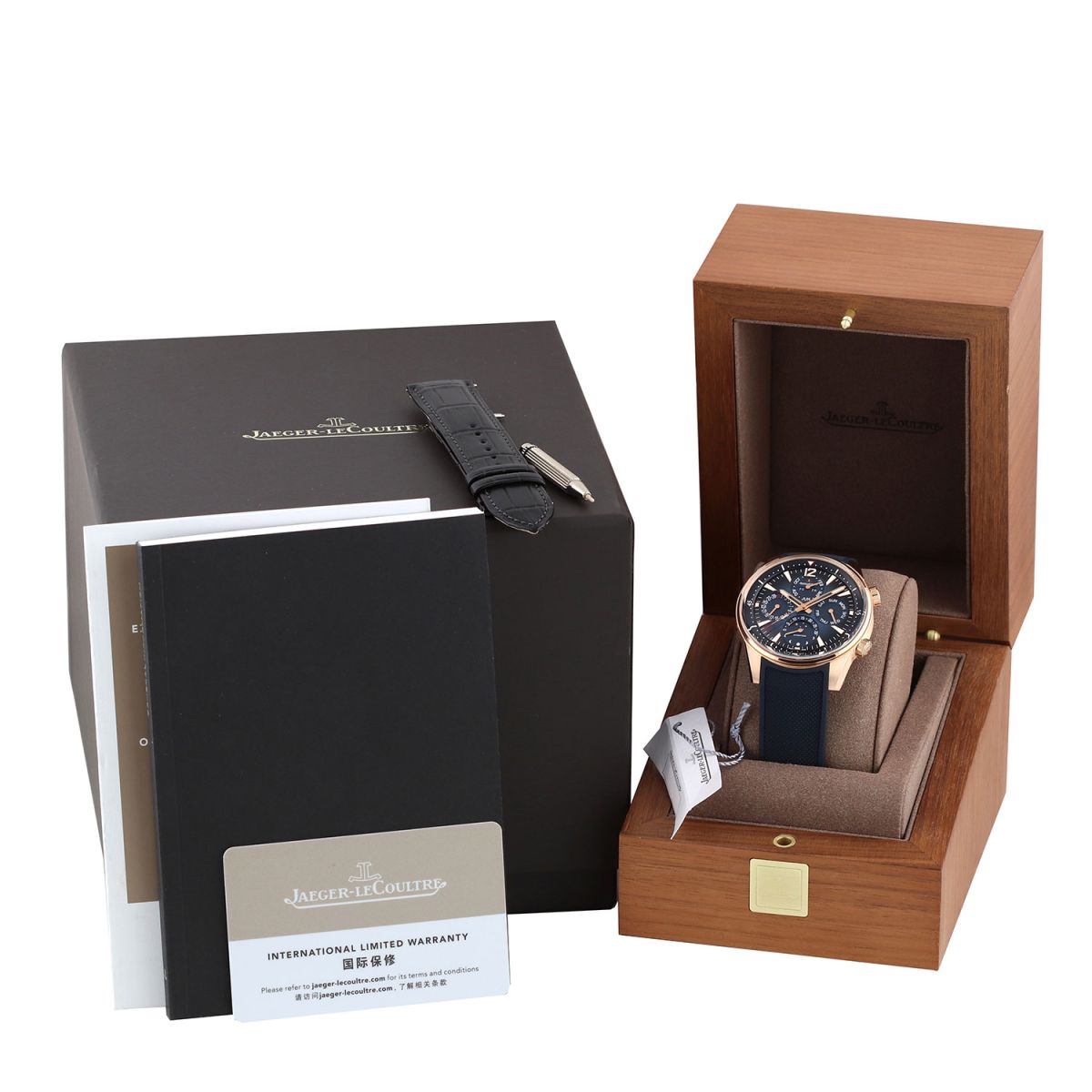 - Fitted on its JLC original blue rubber strap with a solid 18kt rose gold deployant buckle. This strap is excellent near-new condition with its full wear lifespan remaining. We would rate this strap in 99% overall condition.