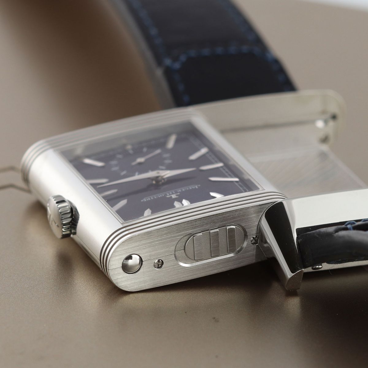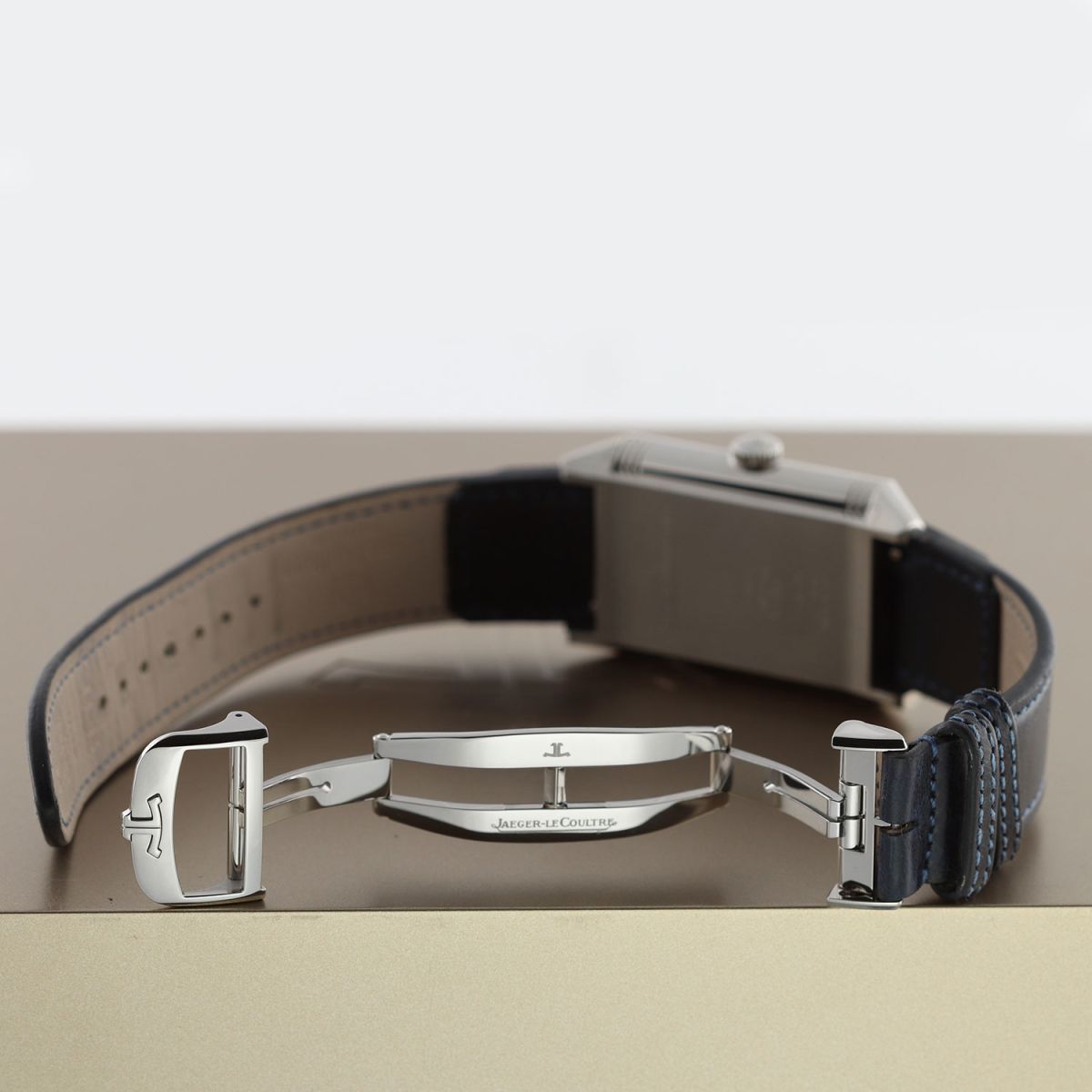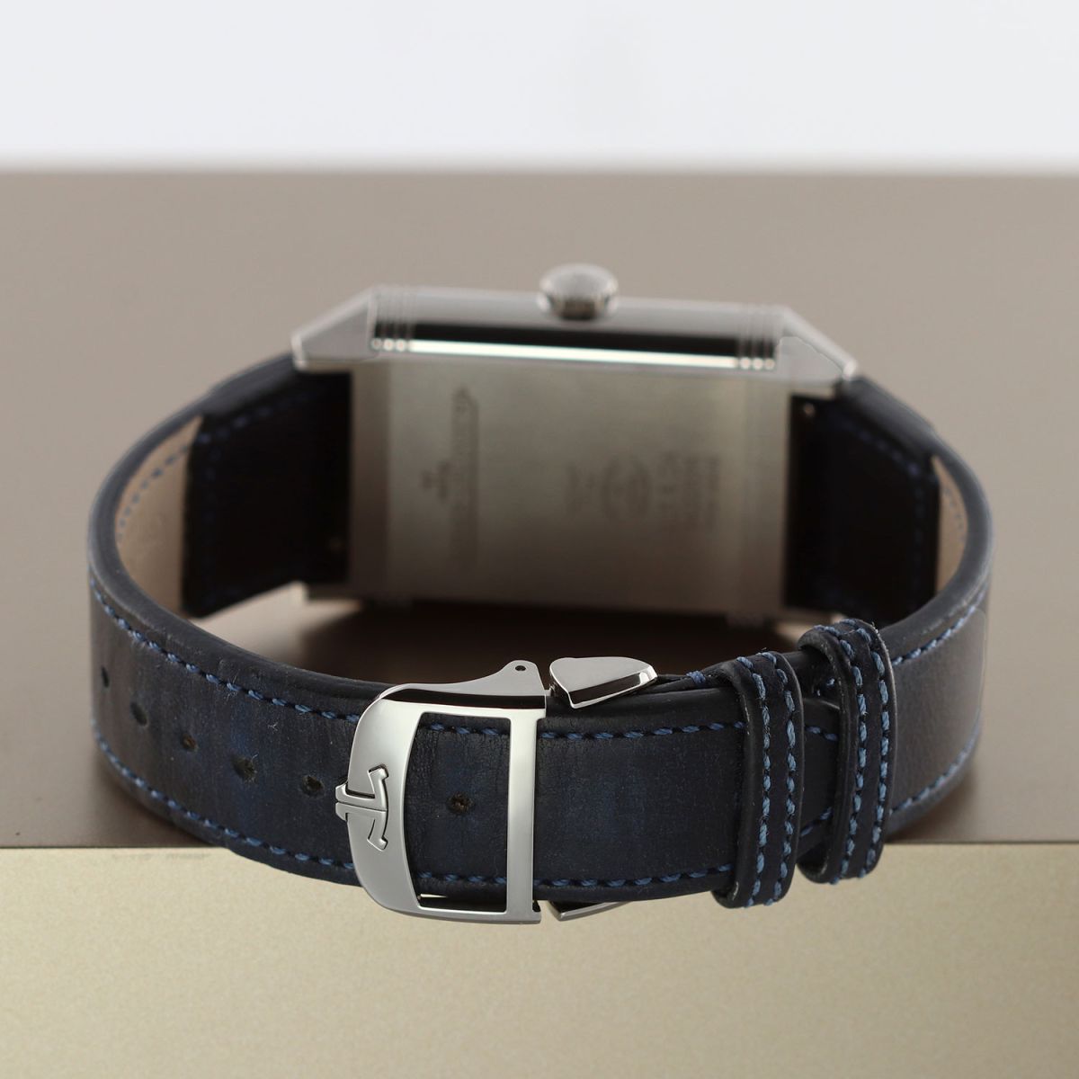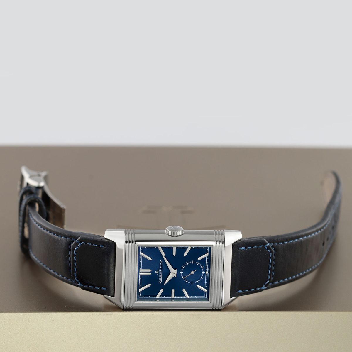 Strap: Fitted on its original Jaeger LeCoultre Casa Fagliano blue cordovan leather strap with a stainless steel deployant buckle.