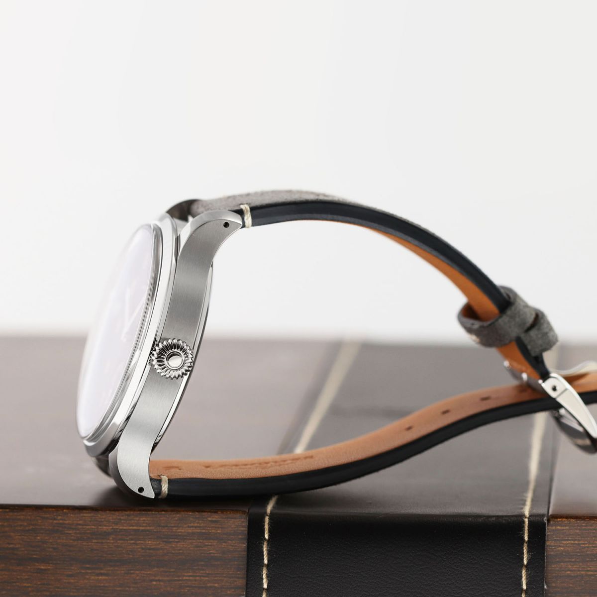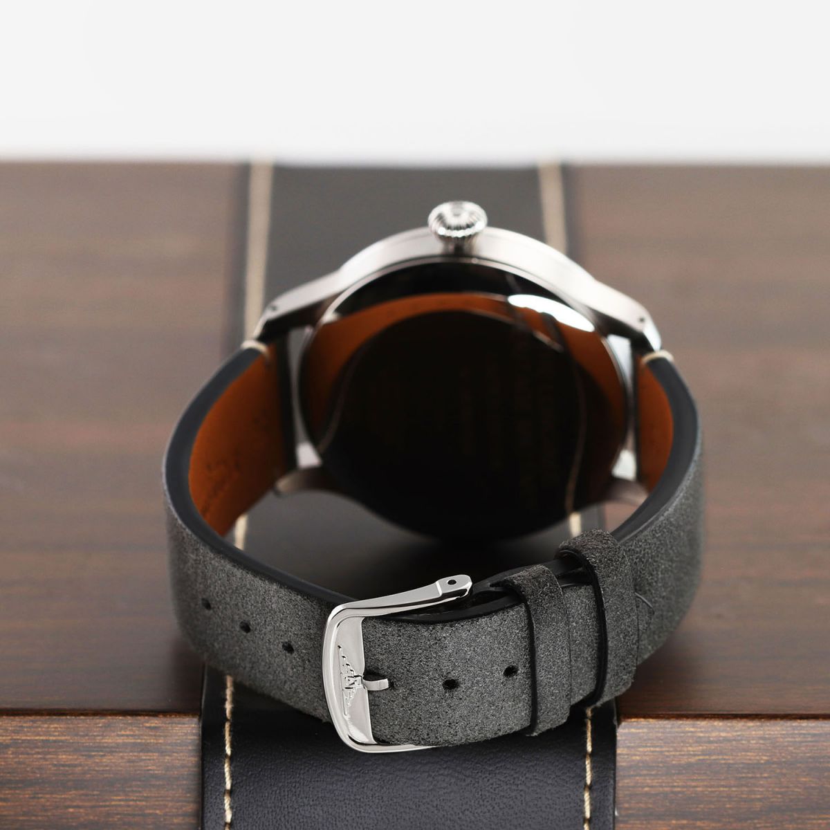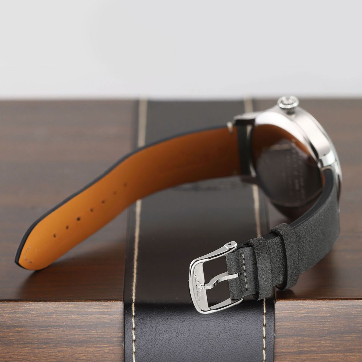- Fitted on its original grey calfskin leather strap with a polished stainless steel tang buckle. The strap is in excellent near-new condition with the majority of its wear life-span remaining. We would rate the strap as in 95%