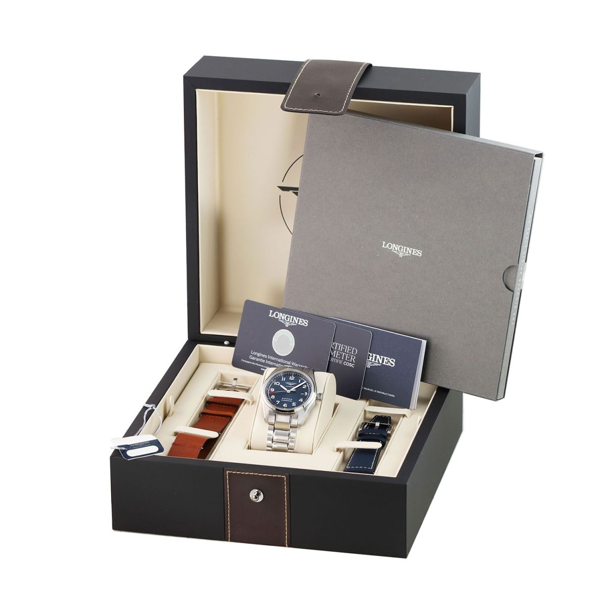- An additional Longines original blue calfskin leather strap with contrasting white stitching & a stainless steel tang buckle. This strap is brand new & unworn with its full wear lifespan remaining.