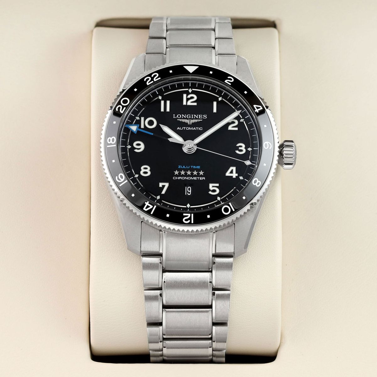 - GMT/Dual Time zone is indicated by the black & blue luminous filled arrow-head hand pointing to the 24 hour indications on the bezel.