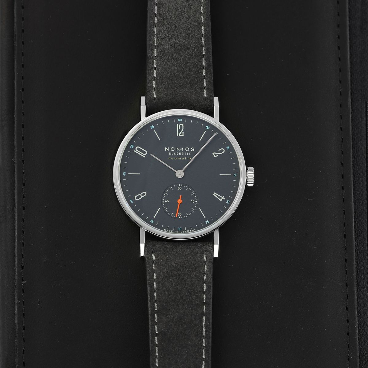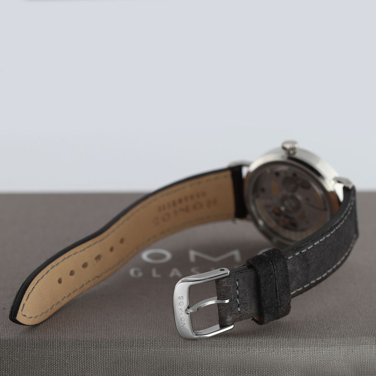 - Fitted on a NOMOS Glashutte original dark grey vegan velour leather (raw hide) strap with a polished stainless steel tang buckle. The strap is in excellent, near new condition with the majority of its wear lifespan remaining. We would be comfortable rating the strap as in 97% condition.