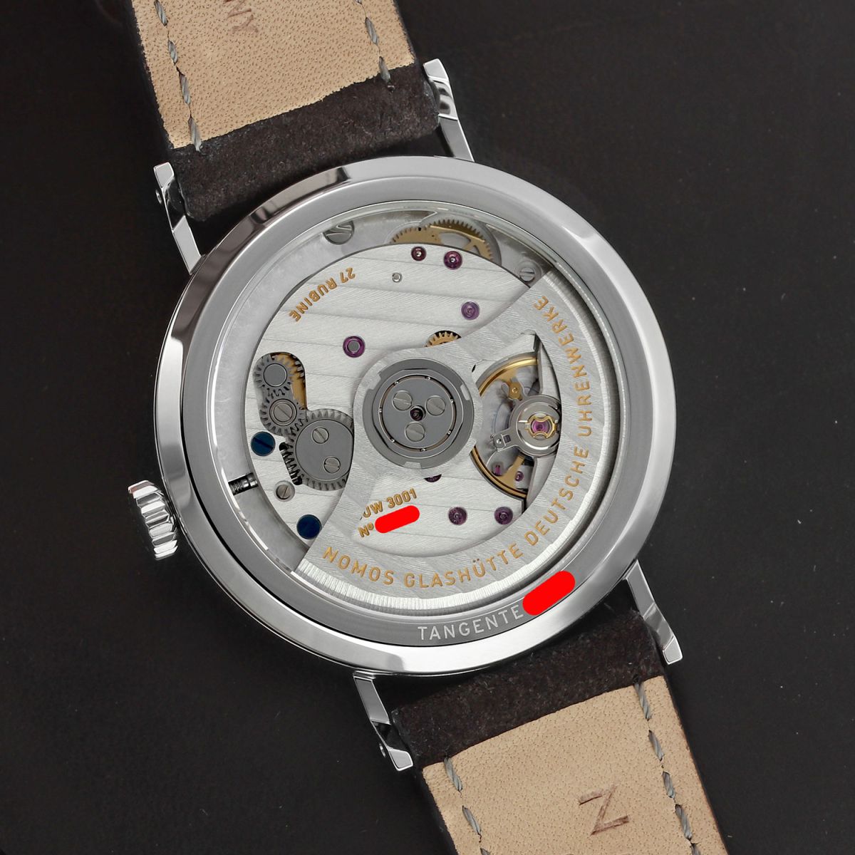 Movement: Powered by a Nomos in-house self-winding caliber DUW 3001, contains 27 jewels & has a power reserve of +/- 42 hours. The movement features the NOMOS swing system, tempered blued steel screws, tempered blued steel balance spring. Rhodium plated surfaces with Glashütte ribbing and NOMOS perlage decoration.