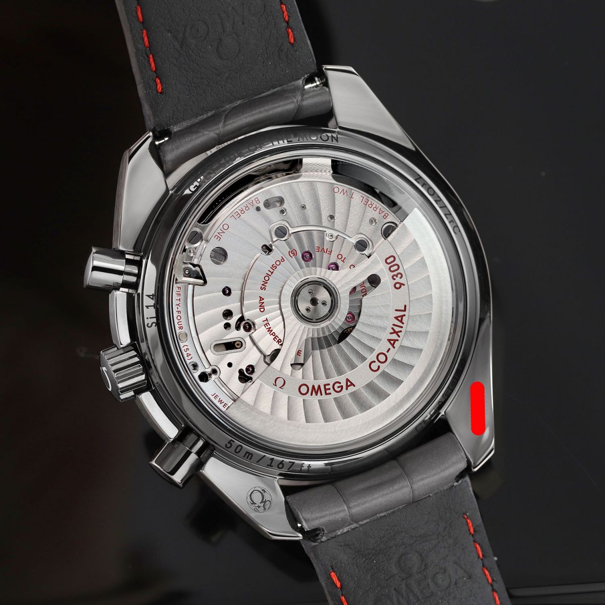 Movement: Powered by an Omega caliber 9300 which beats at 28,800 vph, contains 54 jewels & has an approximate power reserve of 60 hours. Features Omega's Si14 silicon balance spring & Omegas Co-Axial Escapement. The rotor & visible bridges are decorated with a unique arabesque wave design finish.