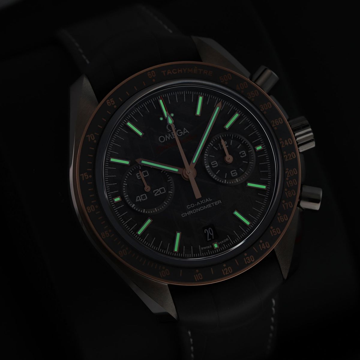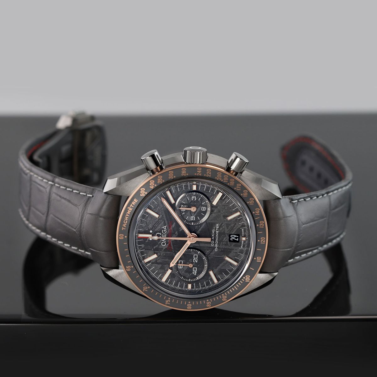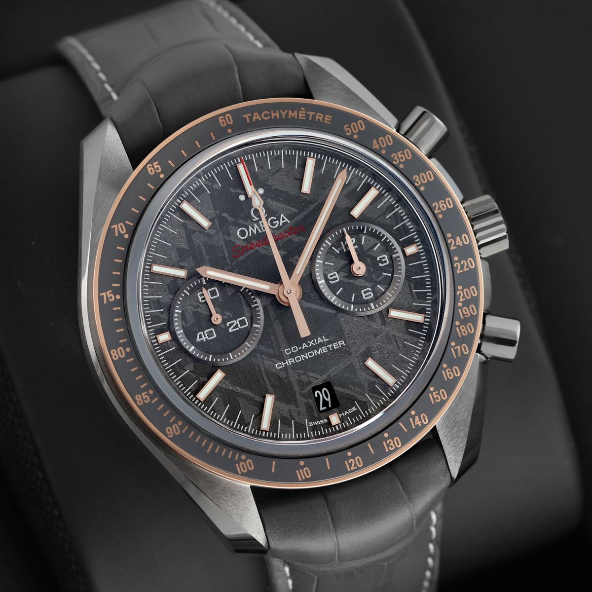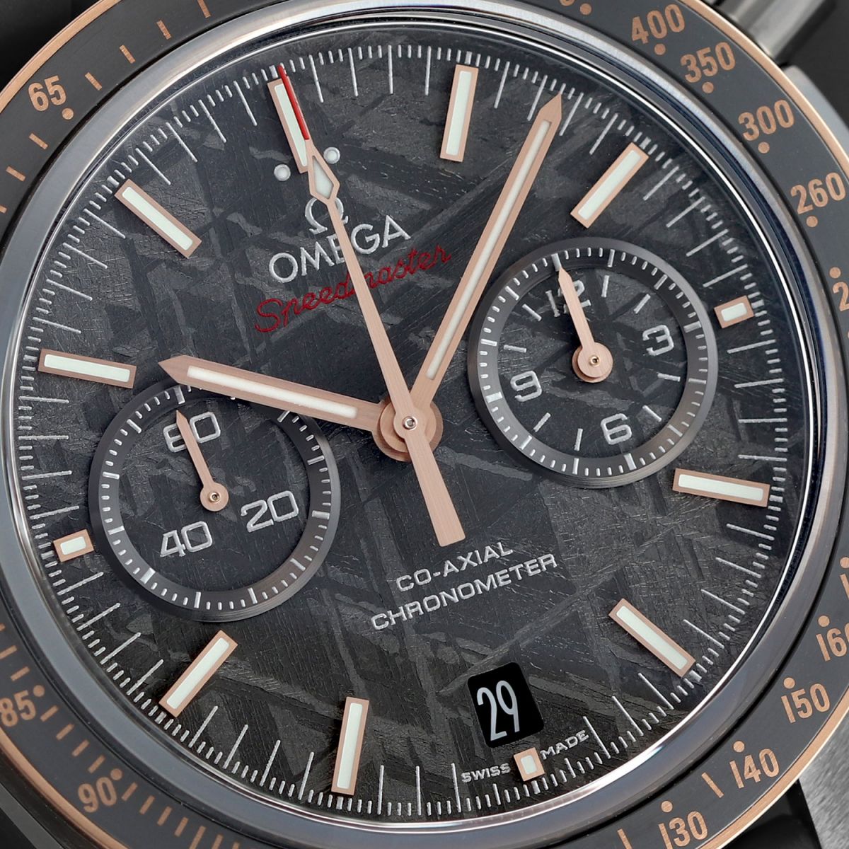 Case: Brushed & polished grey ceramic case. Polished grey ceramic crown & chrono buttons. Fixed 18kt Sedna (rose) gold bezel with a grey silicon nitride ceramic bezel ring & Ceragold Tachymetre scale. Grey meteorite dial. Brushed Sedna gold hands, the central hands with luminous fill. Applied brushed Sedna gold index hour markers with luminous fill. Fine printed minute/seconds & fractions of a second track via laser ablation. Small seconds sub-dial at 9 o'clock. Date window at 6 o'clock. Domed sapphire crystals on front & back.