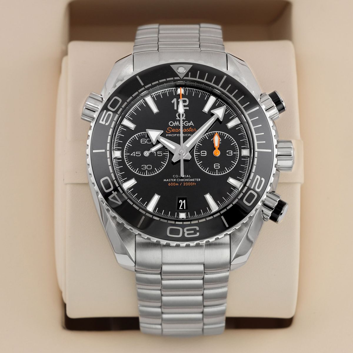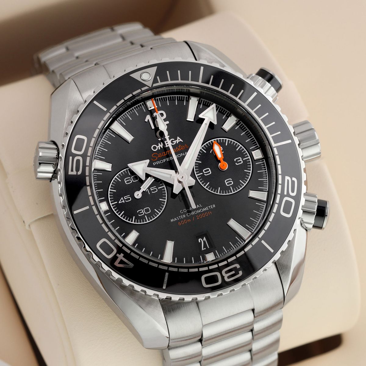 - 60 minute (orange hand) & 12 (polished hand) hour counters are combined into a single sub-dial at 3 o'clock.