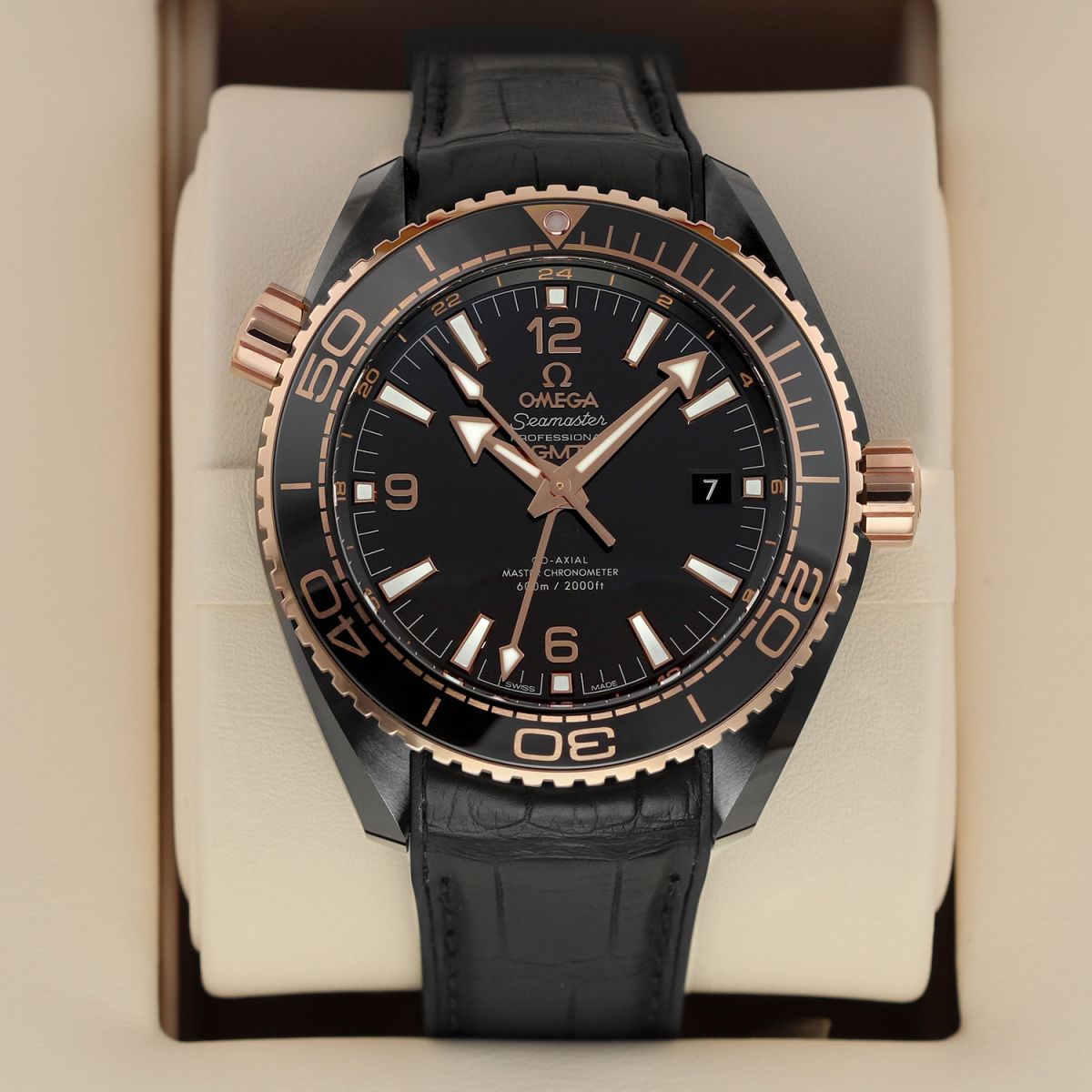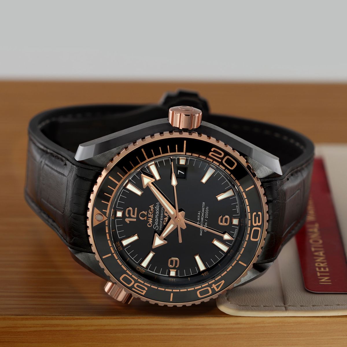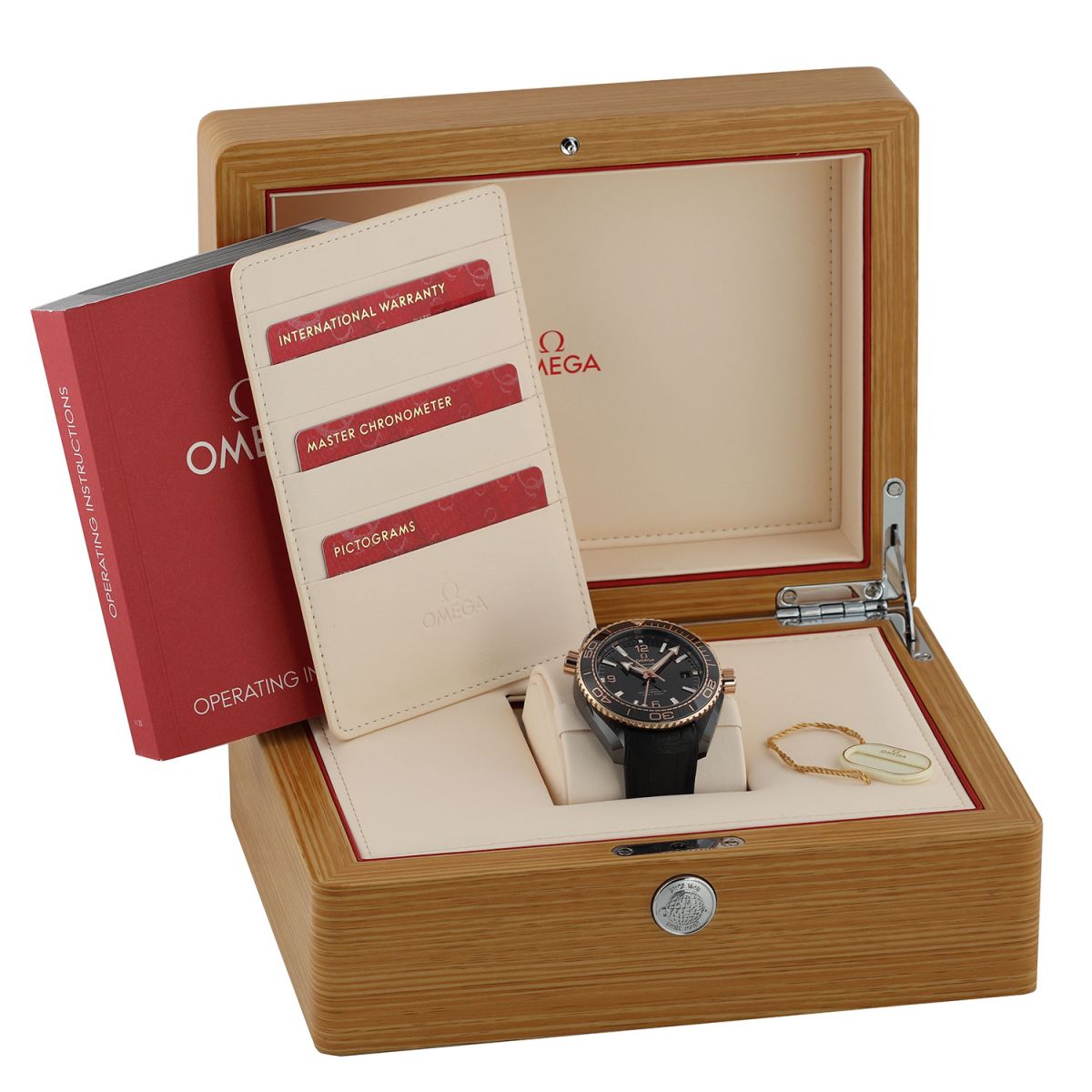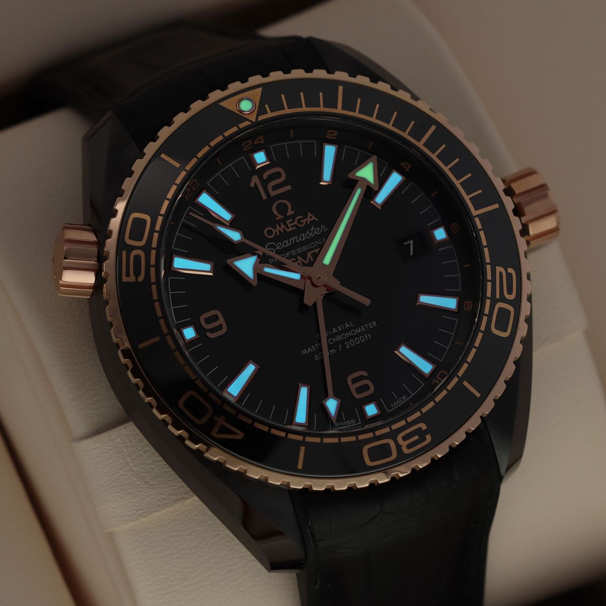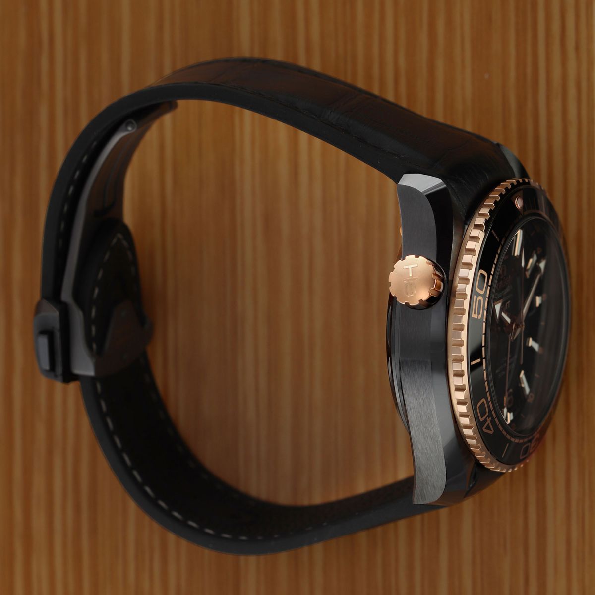 Case: Brushed black ceramic case. 18kt Sedna gold crown & helium escape valve. Solid 18kt Sedna gold bezel with a polished black ceramic bezel ring with satin finished ceragold diving scale & a luminous dot at the starting point. Polished black zirconium oxide ceramic dial, with [ZrO2] engraved at the dial center. Polished faceted Sedna gold hands with luminous fill. Applied polished faceted Sedna gold index hour with luminous fill. Applied Sedna gold 6, 9 & 12 hour markers. Fine printed minutes/seconds track. Date window at 3 o'clock.