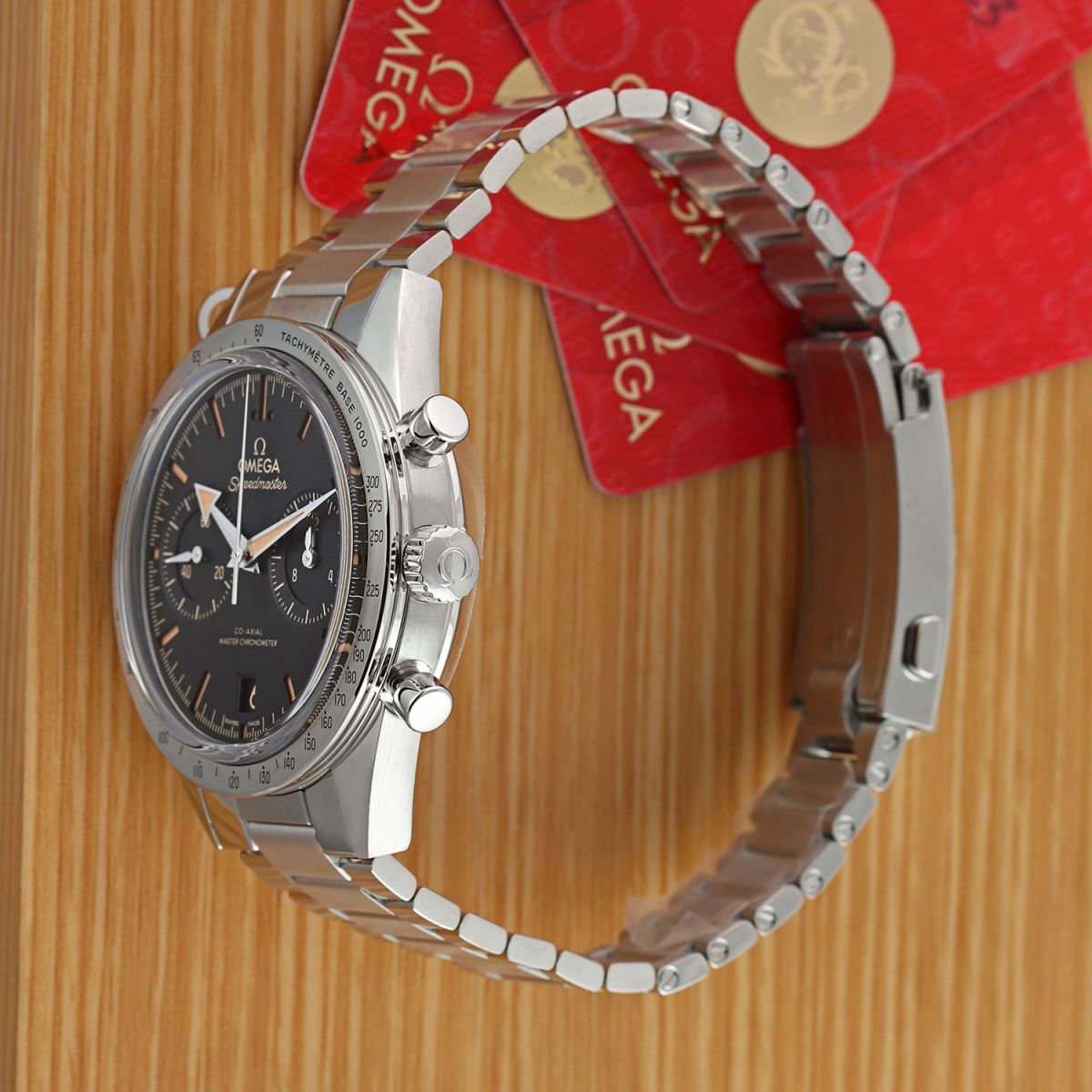 Case: Brushed & polished finished stainless steel case. Fixed position stainless steel bezel with a tachymeter scale. Domed sapphire crystal. Black dial with a very fine textured finish, stepped-down sub-dials. Sandwich construction dial with cut-out index hour marker and with vintage colored luminous backing. Polished hands. Broad-Arrow hour & minute hands with vintage colored luminous fill. Fine printed minutes/seconds & fractions of a second track. Small seconds sub-dial at 9 o'clock. Date window at 6 o'clock.