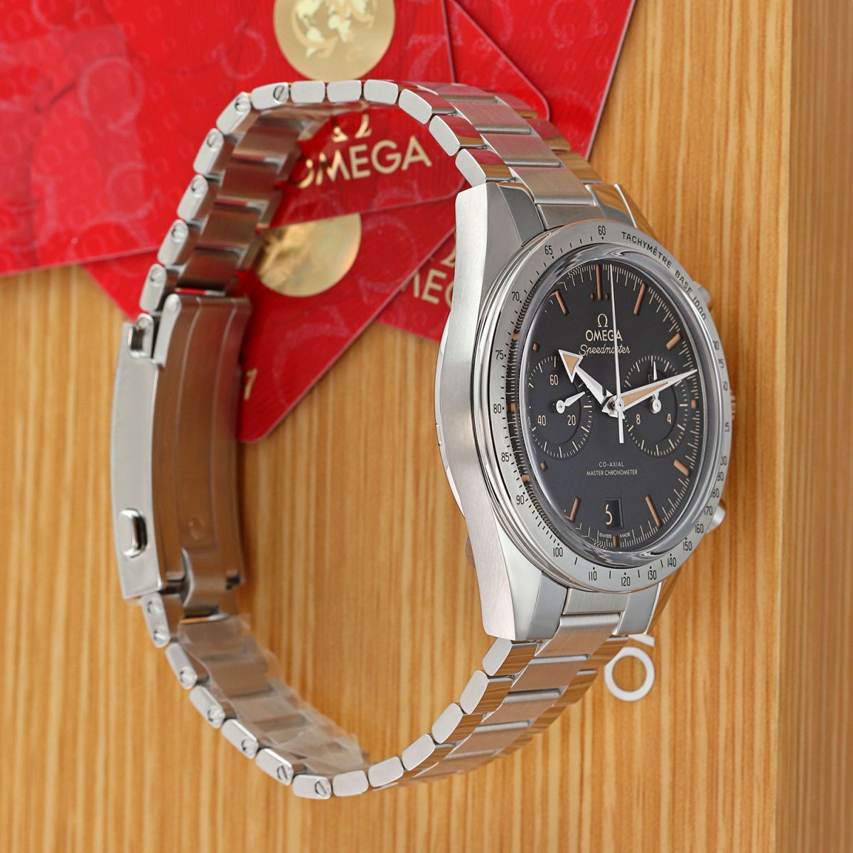 Movement: Powered by an Omega manual winding calibre Master Co-Axial 9906, beats at 28,800 vph (4Hz), contains 45 jewels & power reserve of +/- 60 hours. The movement is a Swiss Federal Institute of Metrology (METAS) certified Master-Chronometer. The METAS certification tests water resistance, precision and magnetic resistance to 15,000 gauss. Features Omega's Si14 silicon balance spring & Omega's Co-Axial Escapement. The back-plate is rhodium plated & decorated with Geneva waves in arabesque design.