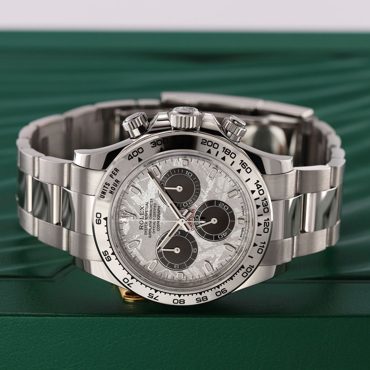 Case: Polished 18kt white gold case, Triplock screw-down crown & screw-down chrono buttons. Polished 18kt white gold bezel, with engraved & black filled Tachymeter scale. Meteorite dial, black sub-dials. Polished white gold hands, the hour & minute hands with partial luminous fill. Applied polished white gold index hour markers with luminous fill. Fine printed minute/seconds & fractions of a second track on the dial perimeter. Small seconds sub-dial at 6 o'clock.