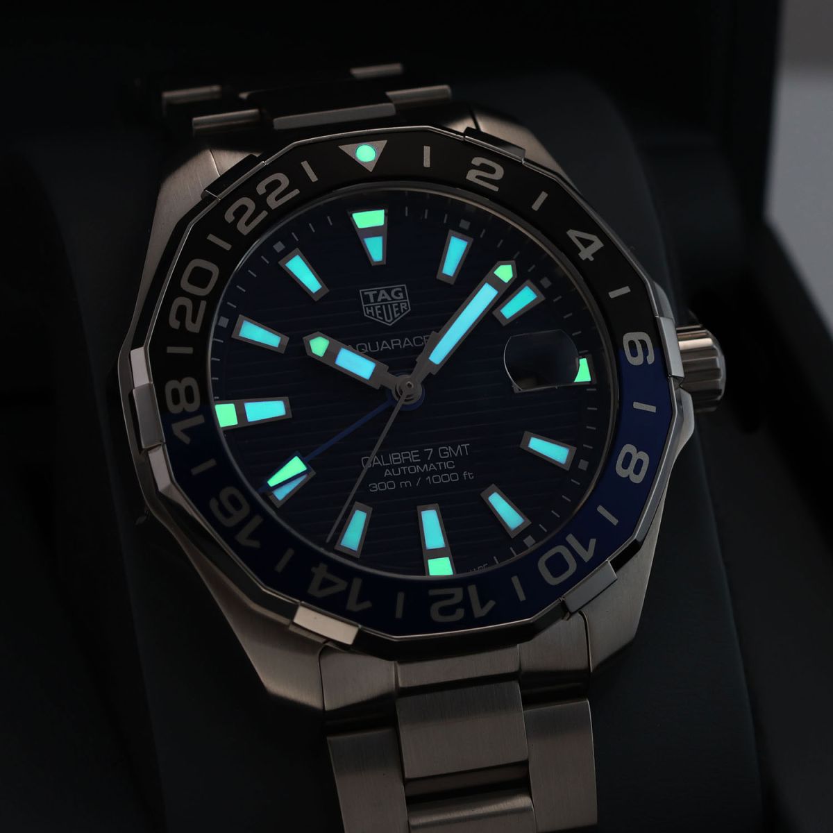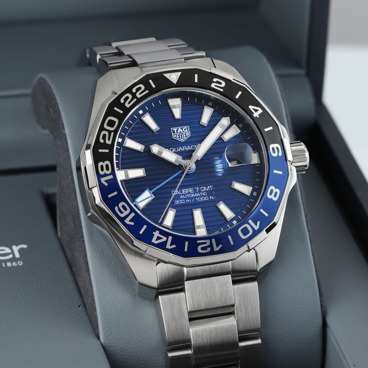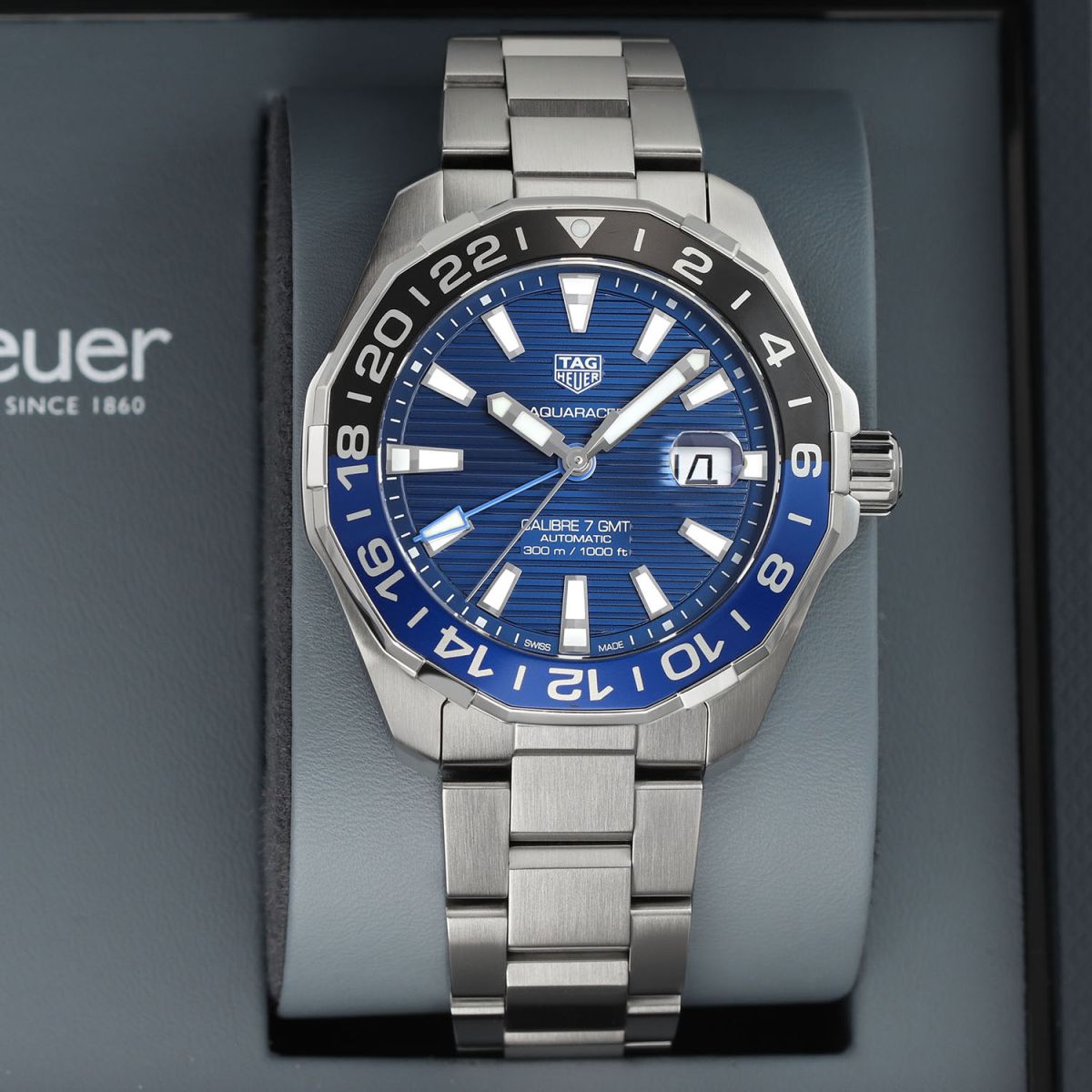 Case: Brushed & polished stainless steel case. Black & blue aluminum bi-directional bezel. Blue dial with linear horizontal pattern. Polished hour, minute & seconds hands, the hour & minute hands with luminous fill. Applied polished index hour markers with luminous fill. Printed minutes/seconds track on the dial flange. Date window with magnifying glass at 3 o'clock.