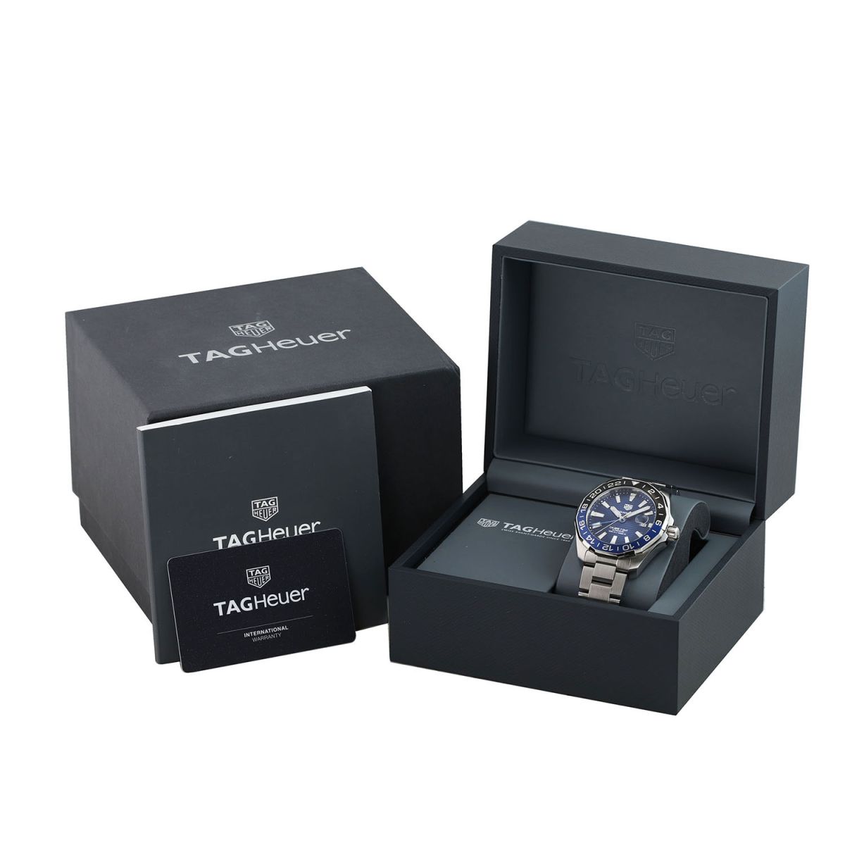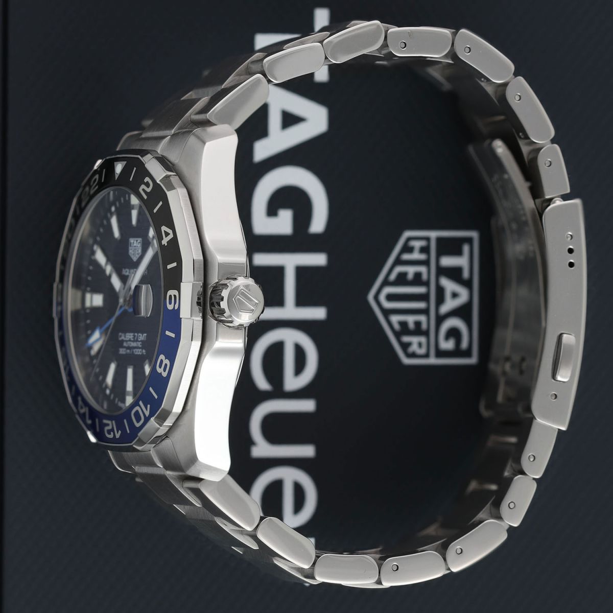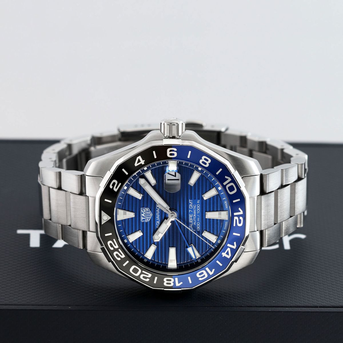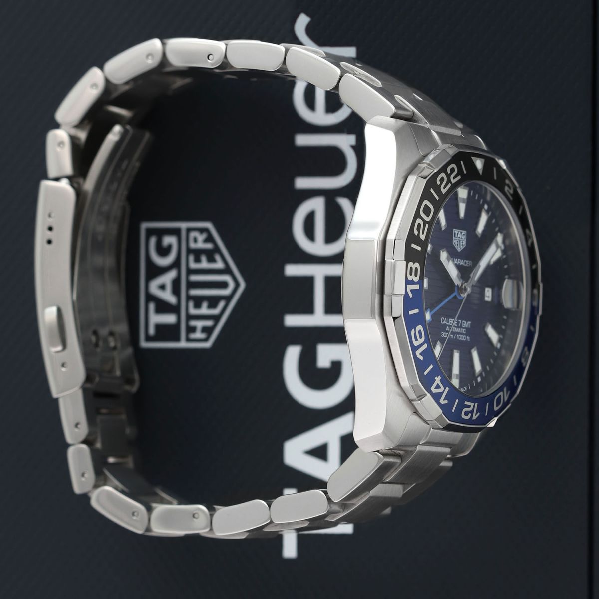 Case: Brushed & polished stainless steel case. Black & blue aluminum bi-directional bezel. Blue dial with linear horizontal pattern. Polished hour, minute & seconds hands, the hour & minute hands with luminous fill. Applied polished index hour markers with luminous fill. Printed minutes/seconds track on the dial flange. Date window with magnifying glass at 3 o'clock.