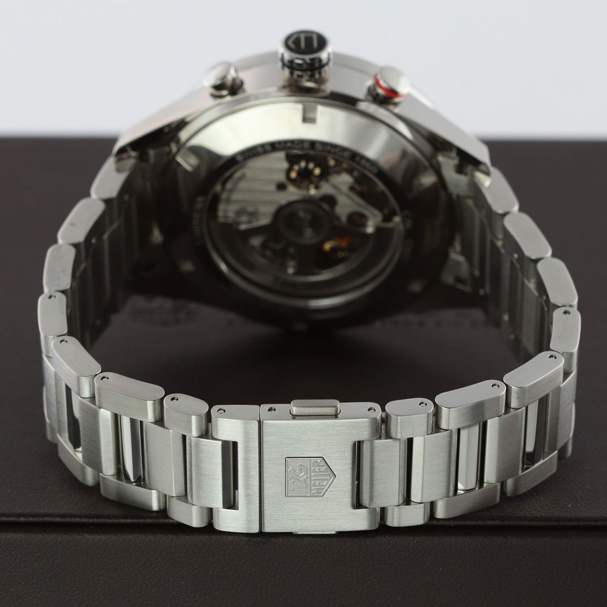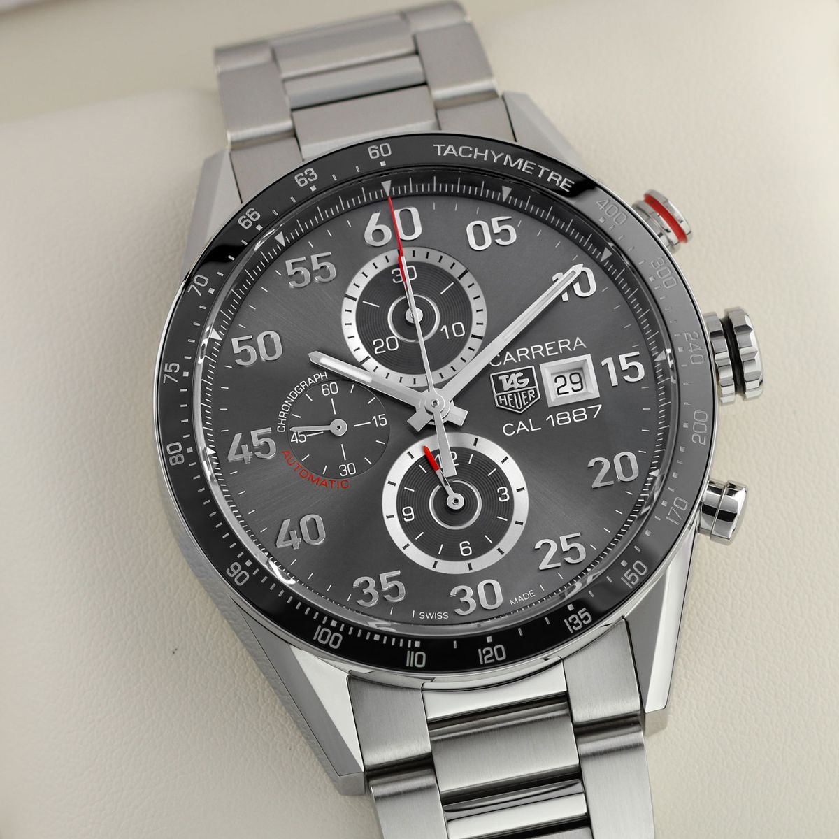 Movement: Powered by a TAG Heuer caliber 1887, beats at 28,800 vph, contains 39 jewels & has a power reserve of +/- 50 or +/- 40 hours when the chronograph is running.
