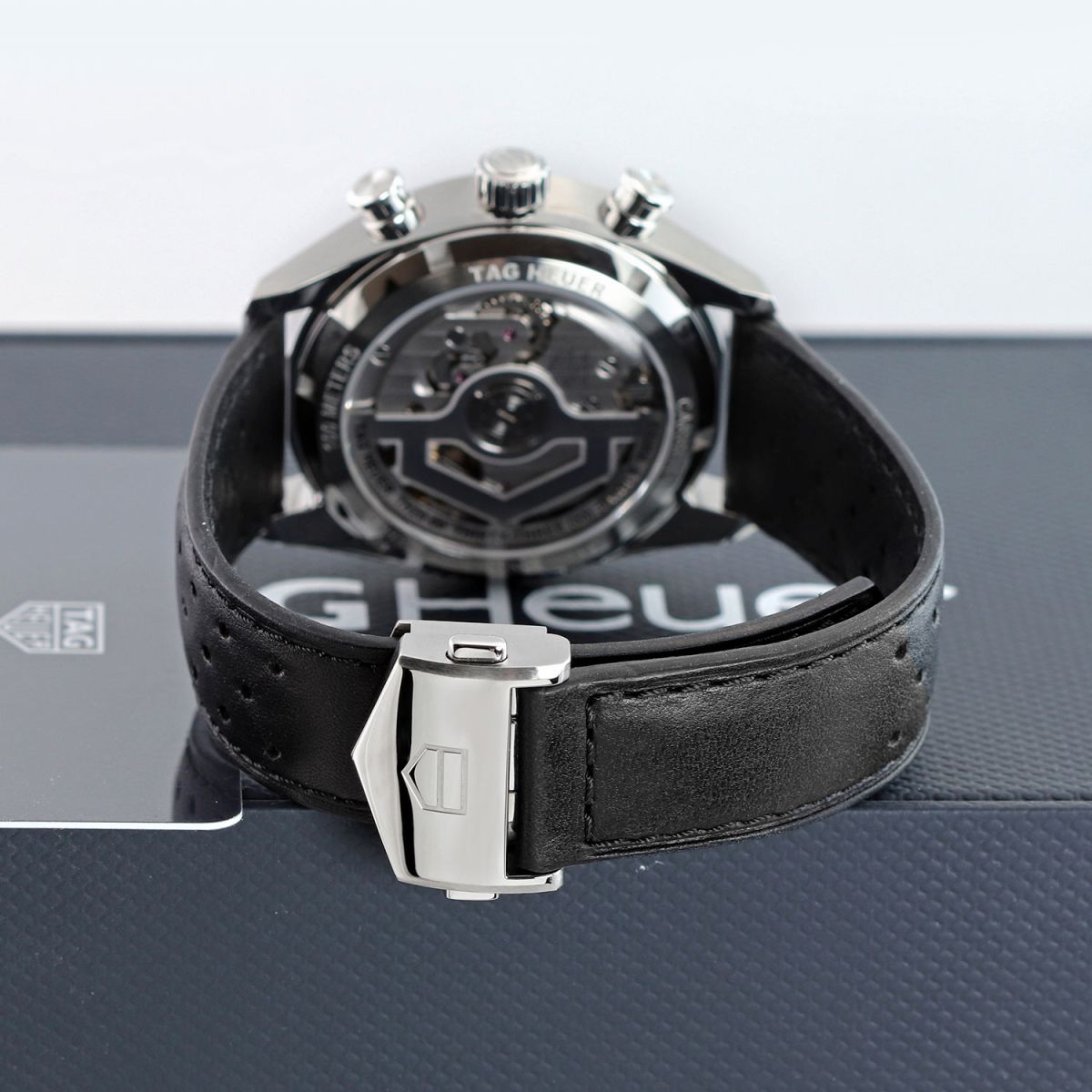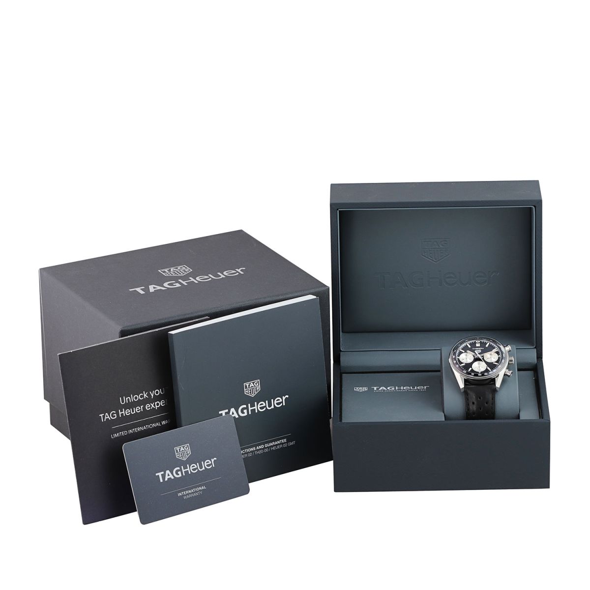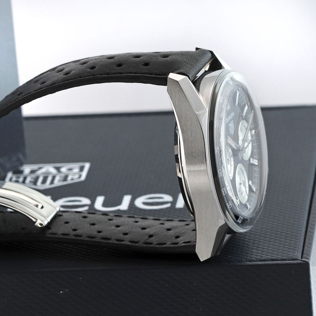 Strap: Fitted on its original TAG Heuer black calfskin leather strap with a stainless steel push-button deployant buckle. The strap is in excellent condition with the vast majority of its wear life-span remaining. We would rate it as being in 97%+ condition.