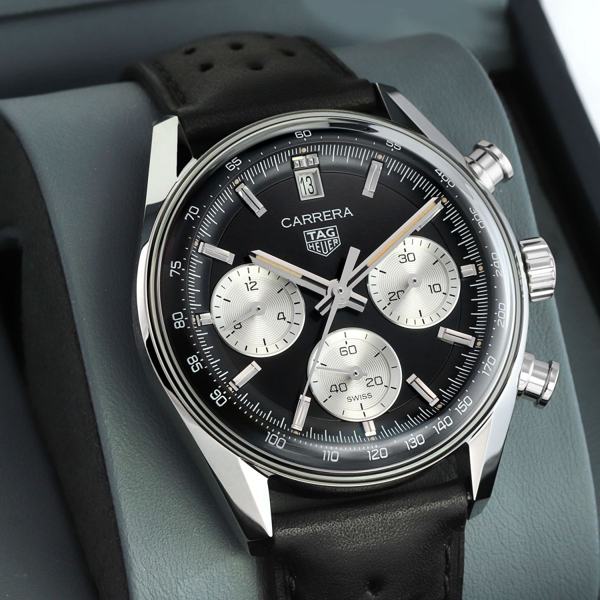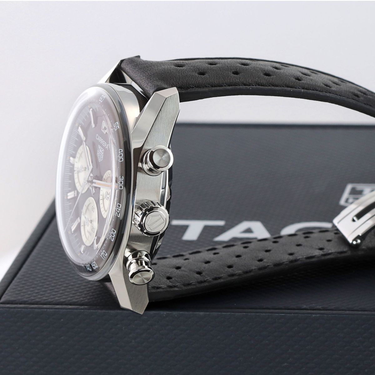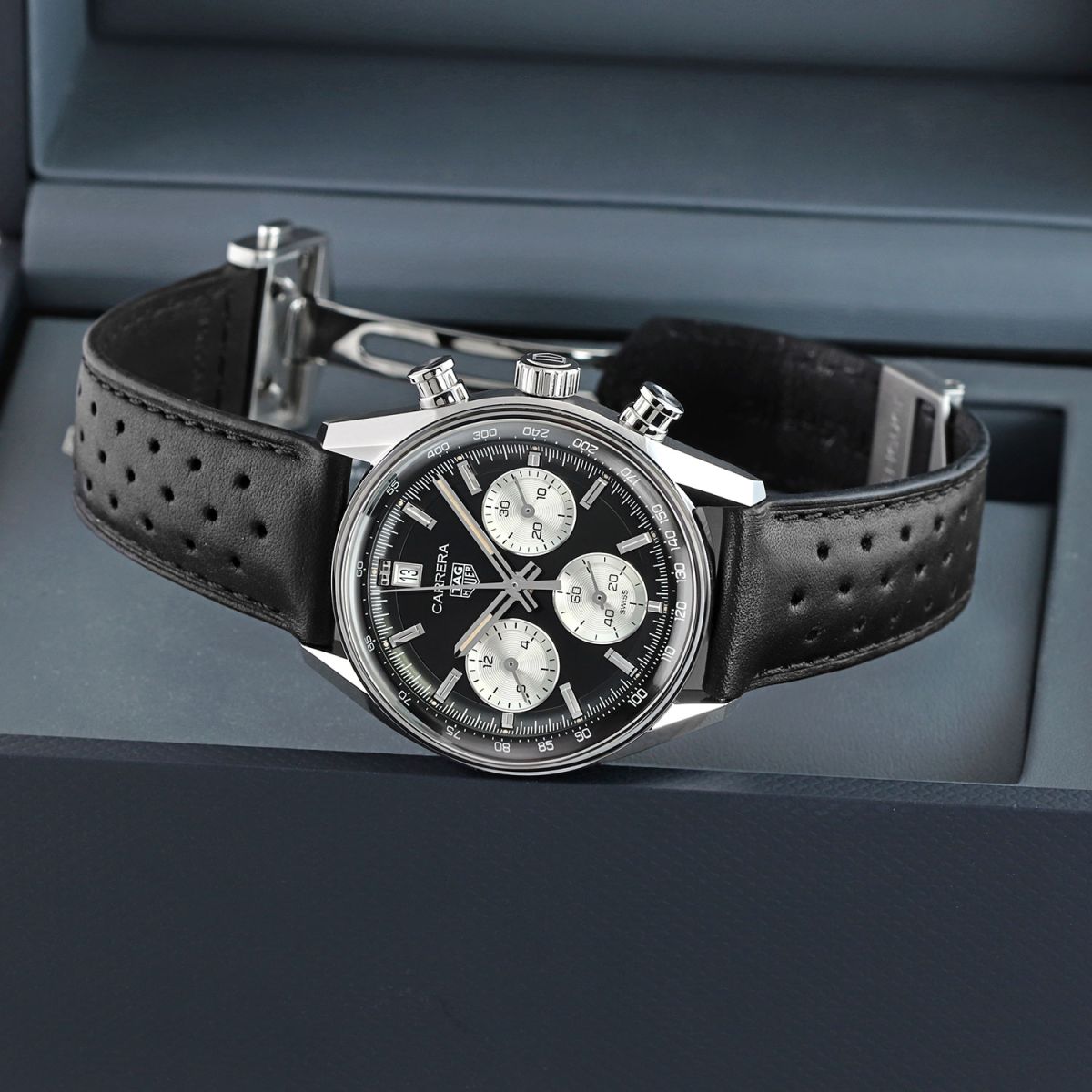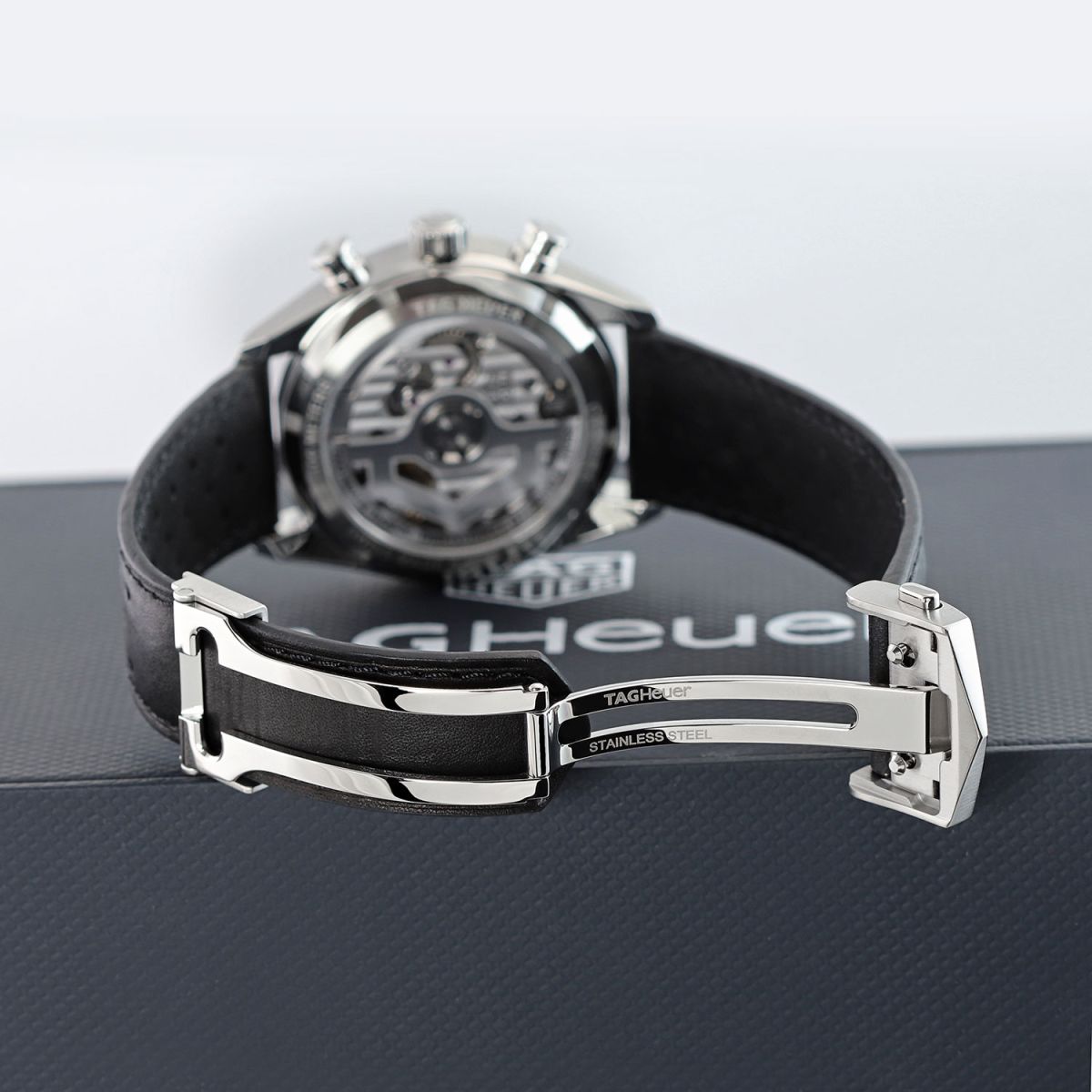 Strap: Fitted on its original TAG Heuer black calfskin leather strap with a stainless steel push-button deployant buckle. The strap is in excellent condition with the vast majority of its wear life-span remaining. We would rate it as being in 97%+ condition.