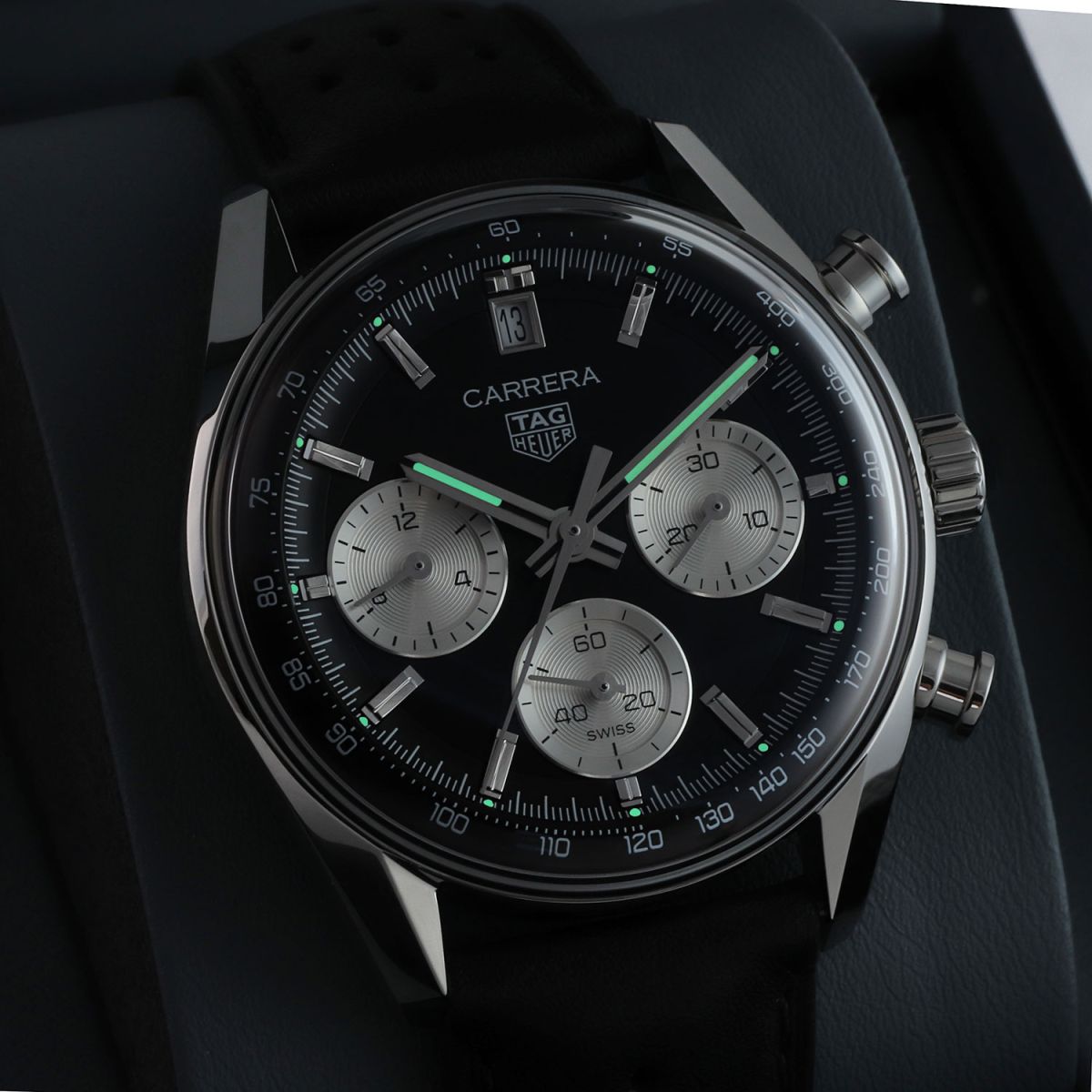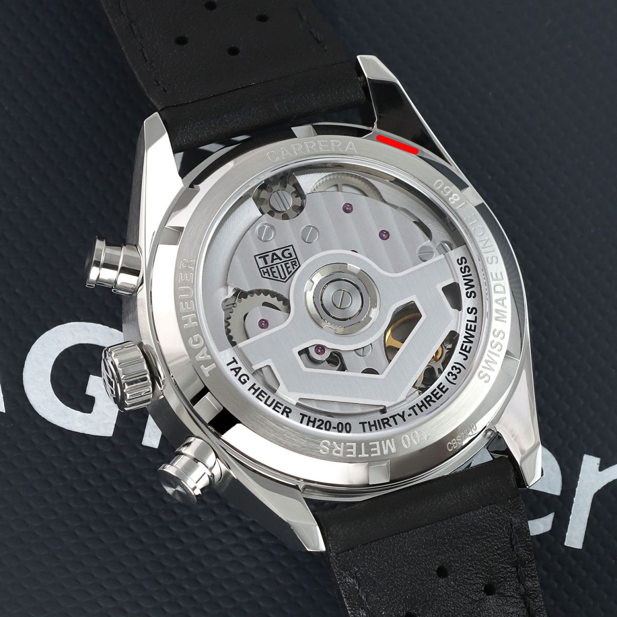 Movement: Powered by a Tag Heuer caliber TH20-00, beats at 28,800 vph (4Hz), contains 33 jewels & has a power reserve of +/- 80 hours (or +/- 65 hours if the chronograph function is running).