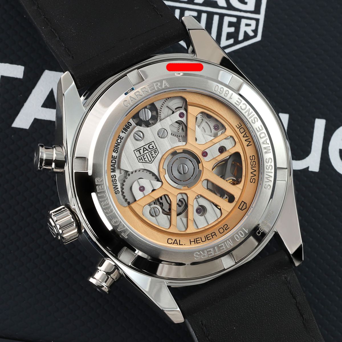 Movement: Powered by an in-house Tag Heuer calibre HEUER 02, beats at 28,800 vph (4Hz), contains 33 jewels & has a power reserve of +/- 80 hours (or +/- 65 hours if the chronograph function is running). Features a PVD rose gold plated open-worked oscillating weight