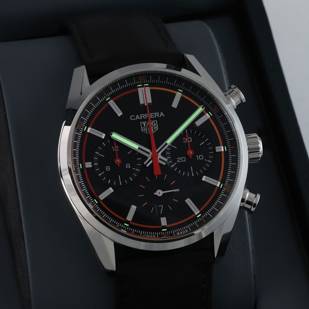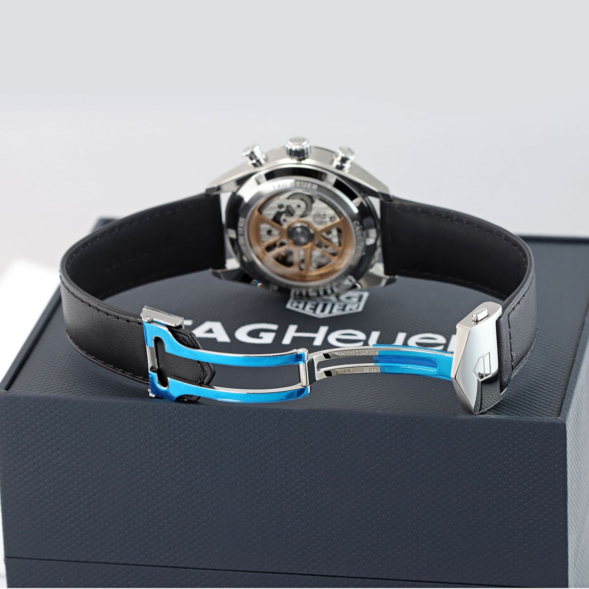 Strap: Fitted on its original TAG Heuer black calfskin leather strap with a push-button stainless steel deployant buckle. The strap is unworn in new condition with its full wear life-span remaining.