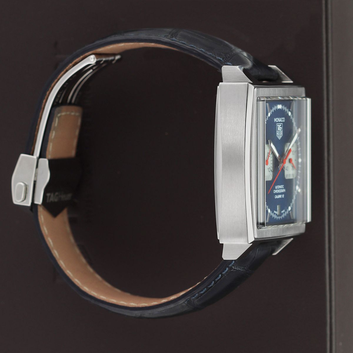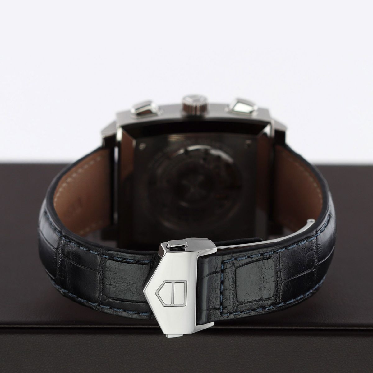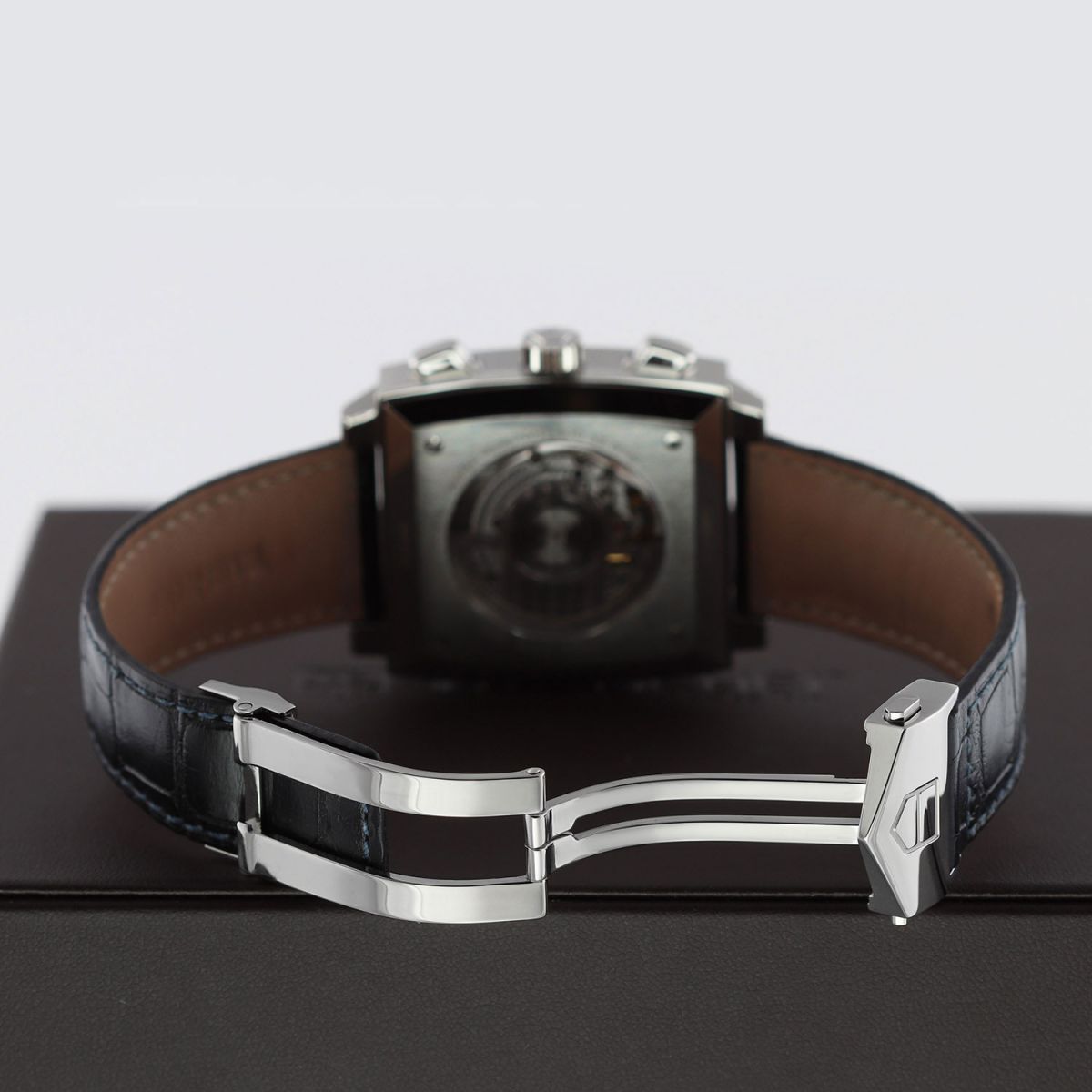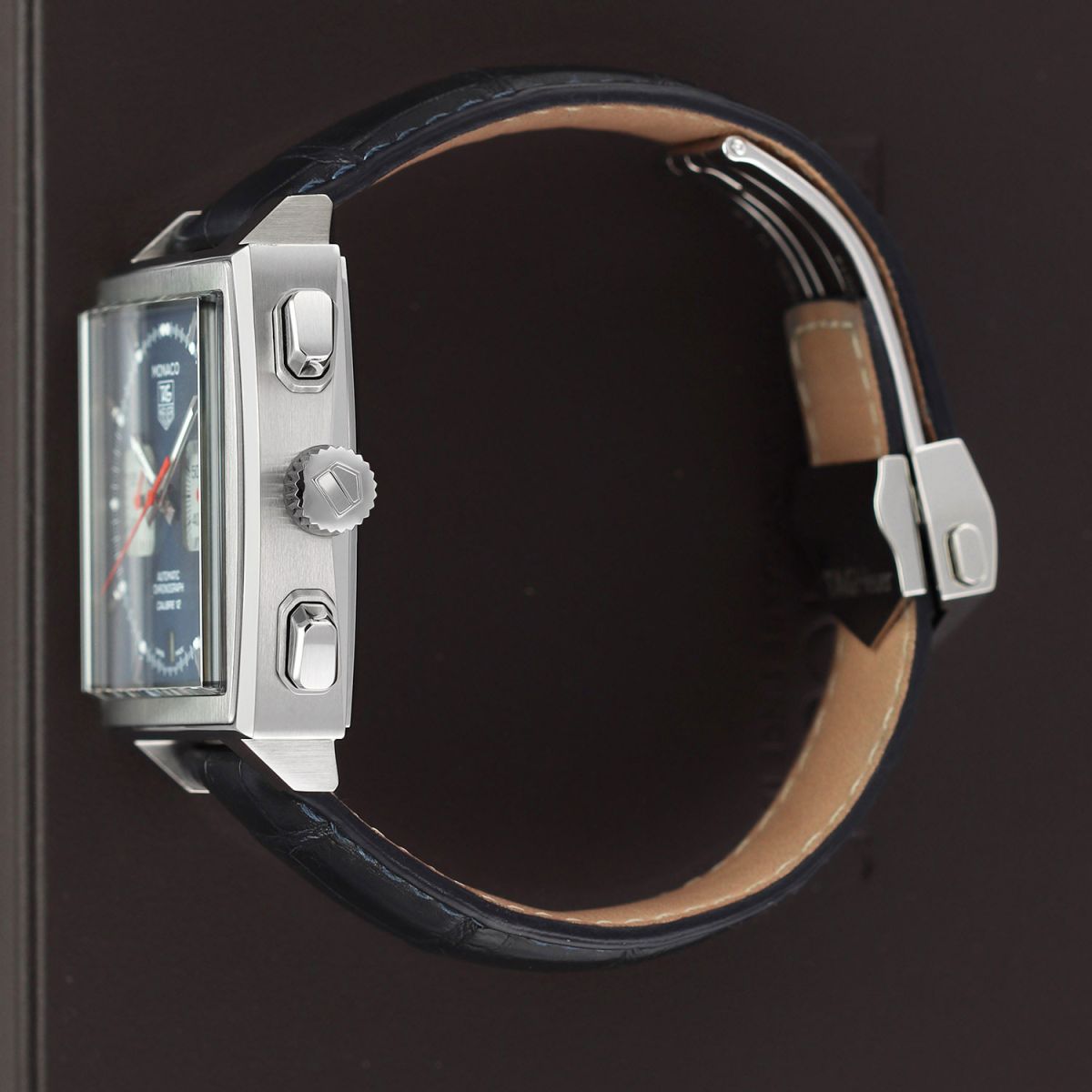 - Fitted on its original TAG Heuer blue alligator leather strap with a stainless steel push-button deployant buckle. The strap is in excellent near-new condition with the majority of its wear life-span remaining. We would be comfortable rating this strap in 95% overall condition.