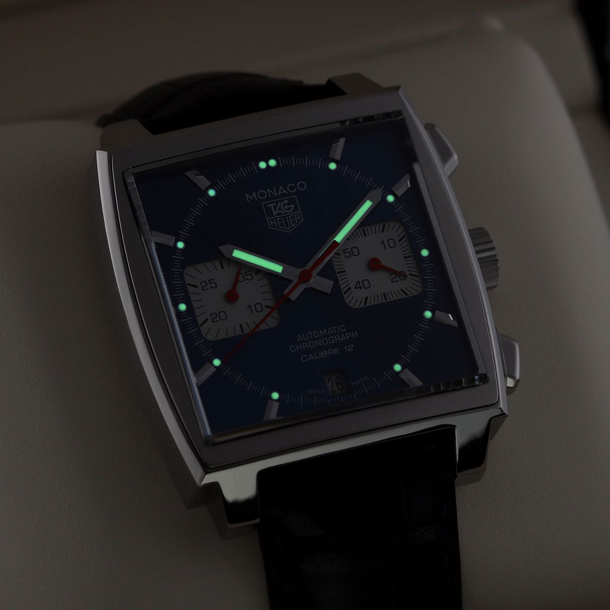 Movement: Powered by a TAG Heuer caliber 12 (base Sellita SW300-1 with a Dubois-Depraz chronograph module), beats at 28,800 vph, contains 59 jewels & has a power reserve of +/- 40 hours.