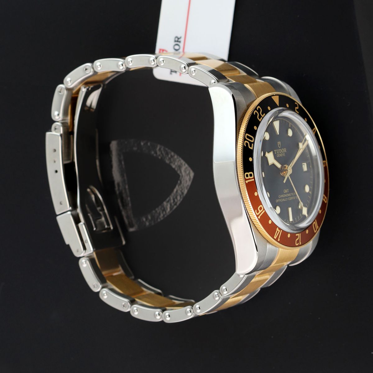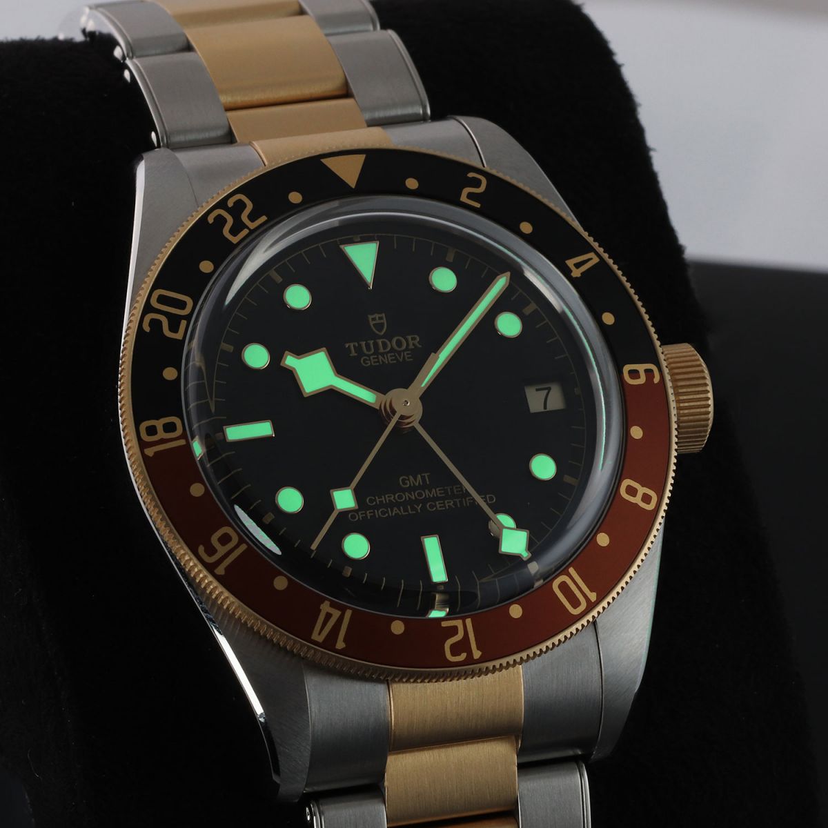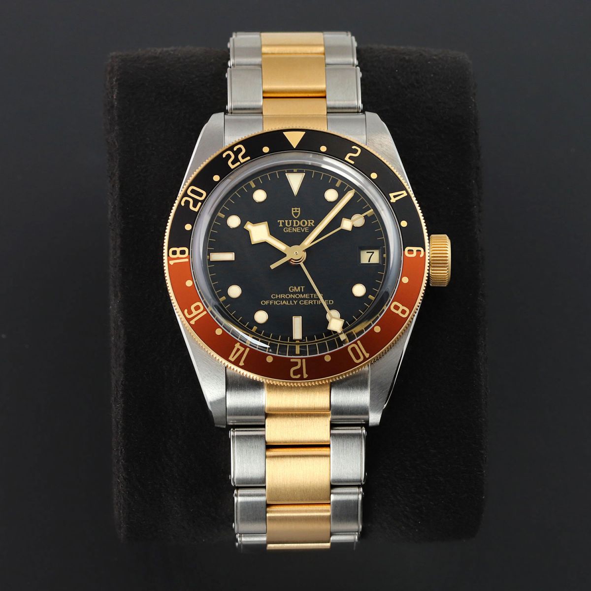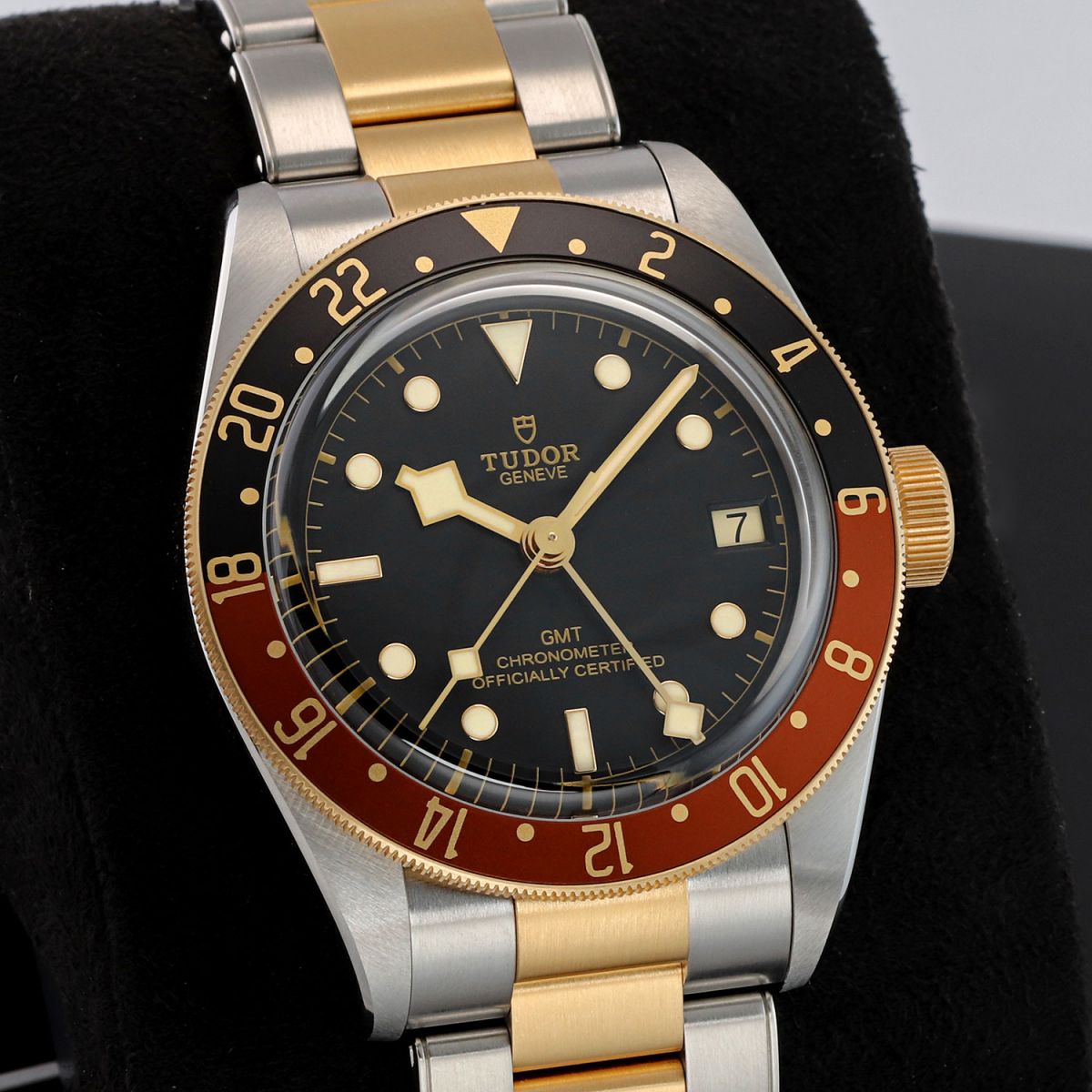 Case: Brushed & polished stainless steel case. 18kt yellow gold capped bezel featuring a brown & black "Root Beer" aluminum bezel ring with 24 hour indications. 18kt yellow gold capped crown with the TUDOR rose engraved. Matte black dial. Polished gold toned angular 'snowflake' hands with luminous fill. Applied polished gold toned hour markers with luminous fill. Fine printed minute/seconds track.