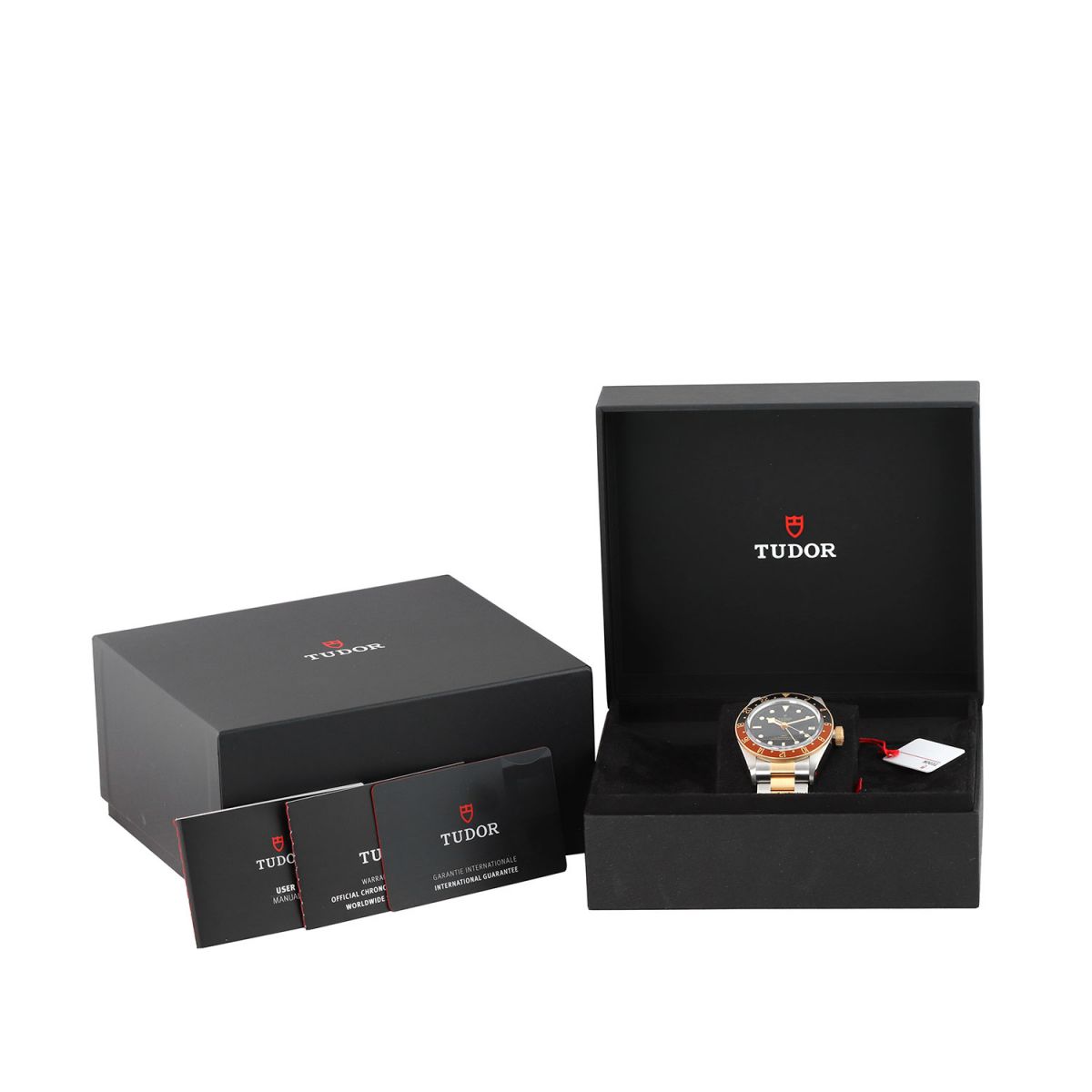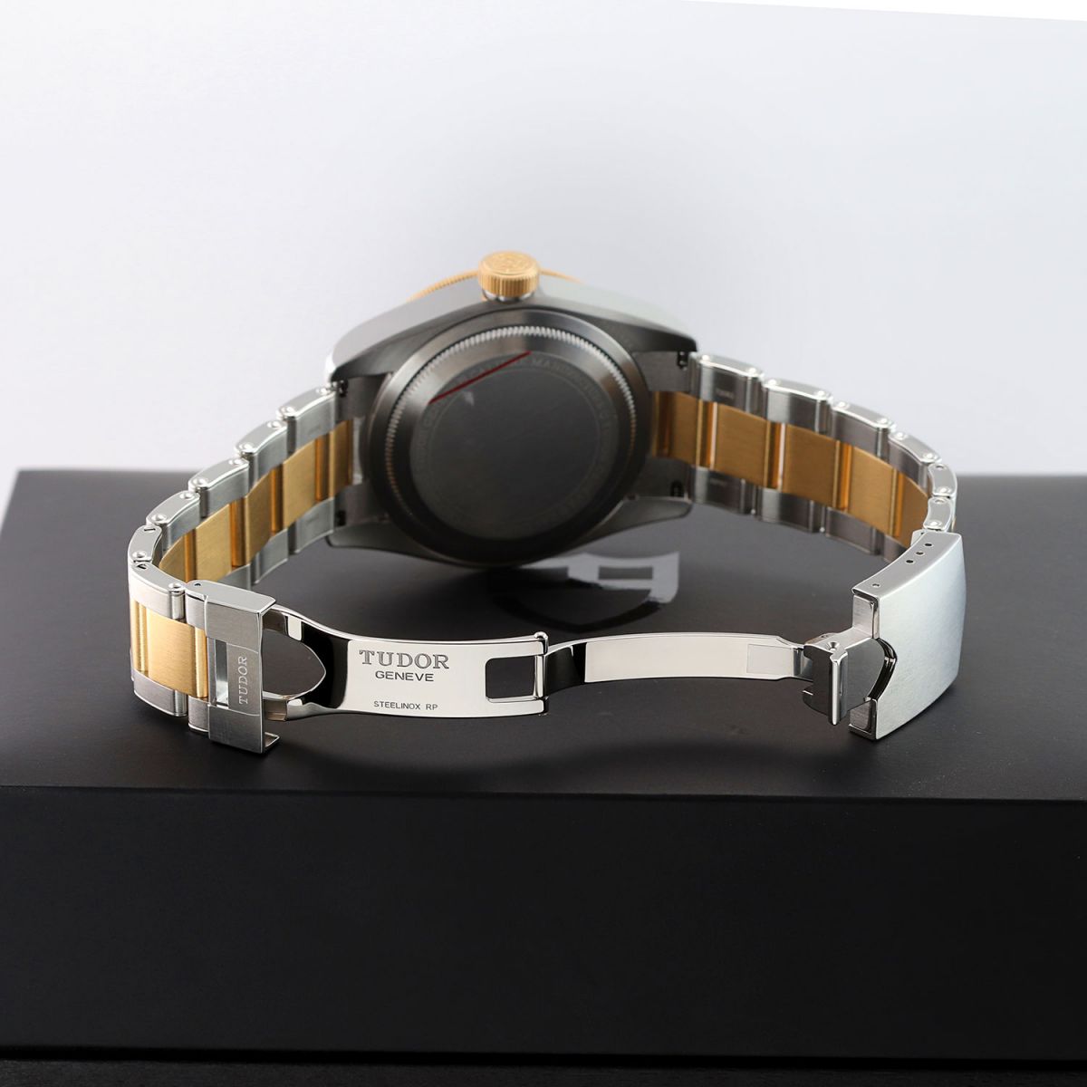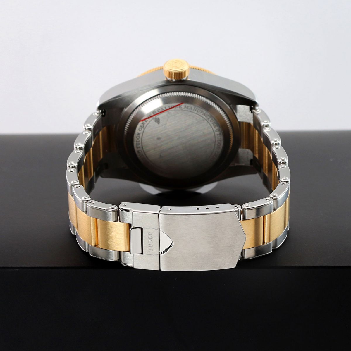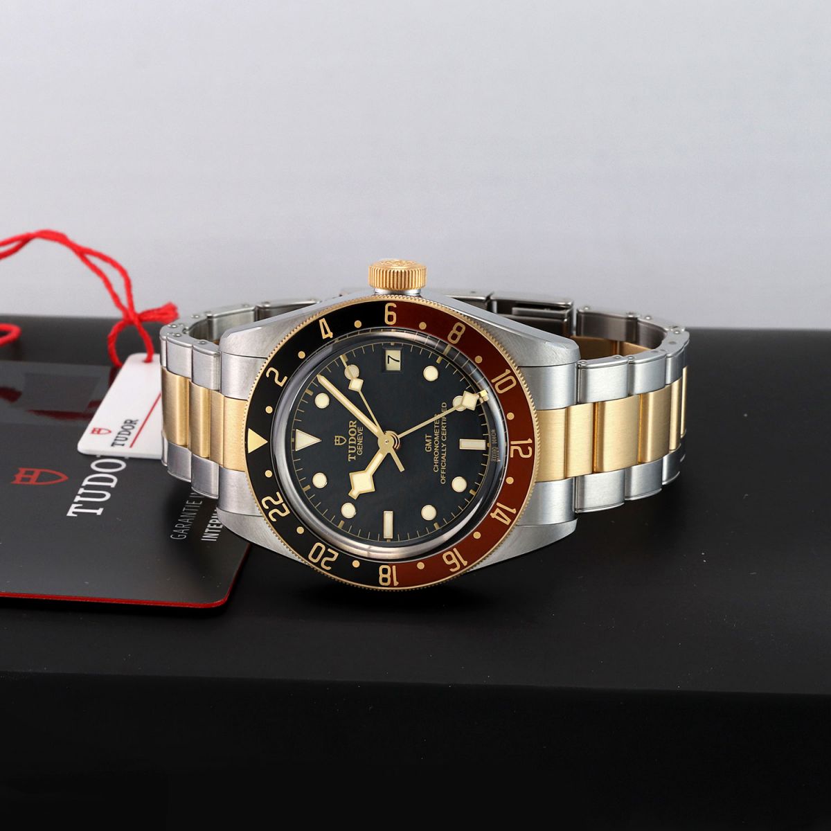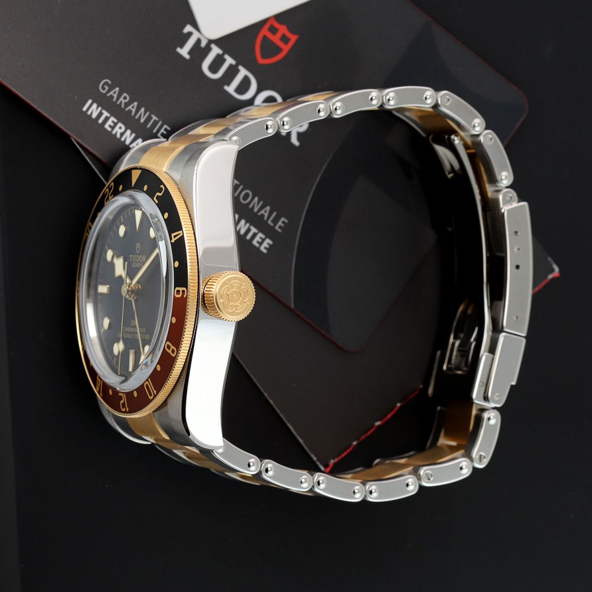 Case: Brushed & polished stainless steel case. 18kt yellow gold capped bezel featuring a brown & black "Root Beer" aluminum bezel ring with 24 hour indications. 18kt yellow gold capped crown with the TUDOR rose engraved. Matte black dial. Polished gold toned angular 'snowflake' hands with luminous fill. Applied polished gold toned hour markers with luminous fill. Fine printed minute/seconds track.