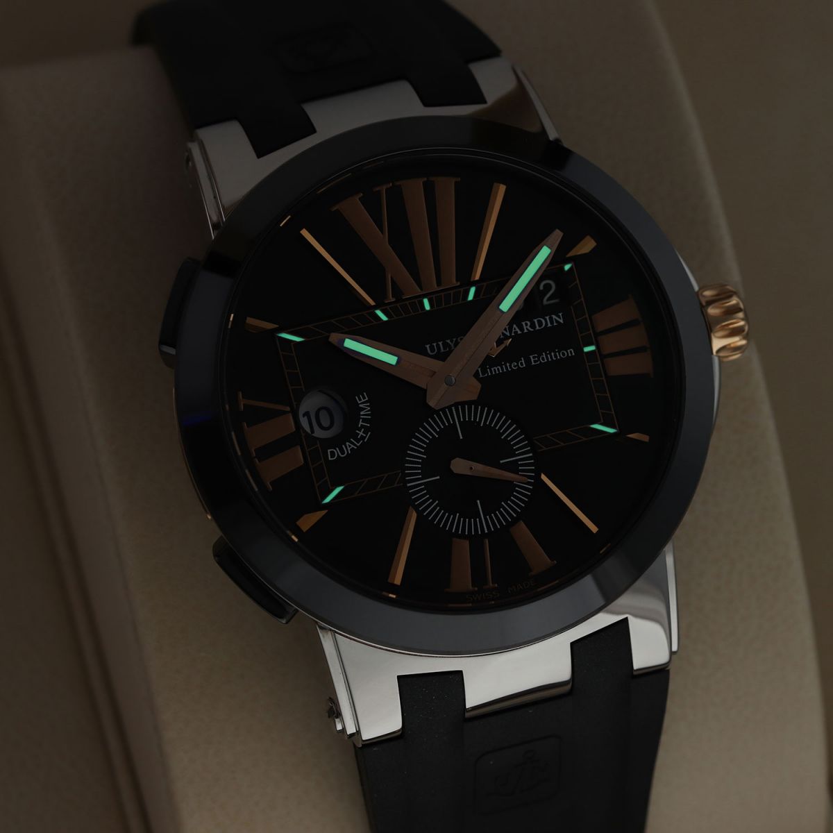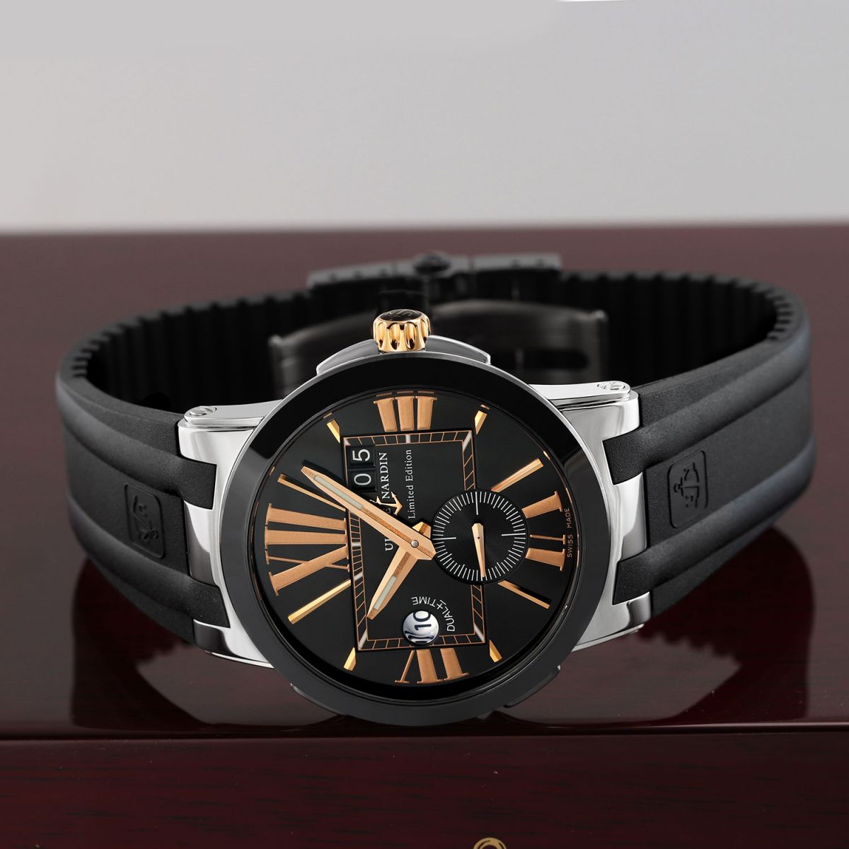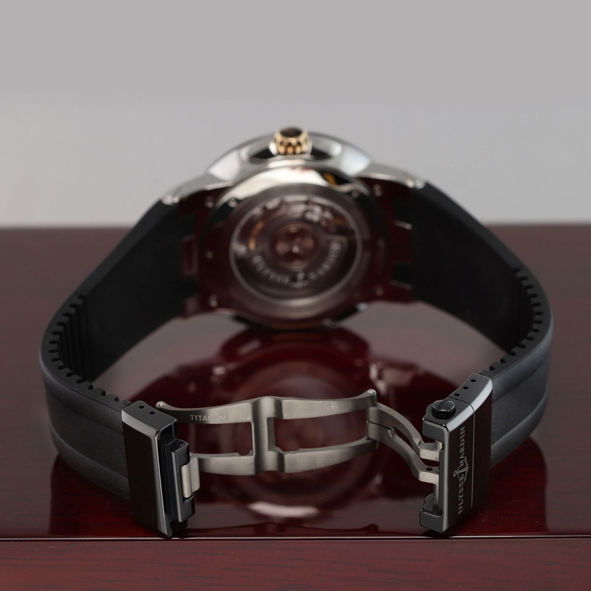 Strap: Fitted on its original Ulysse Nardin black rubber strap with a push-button black ceramic & titanium deployant buckle. The strap is at full length & will fit up to a 9" wrist. The strap will in all likelihood need to be cut down to size.